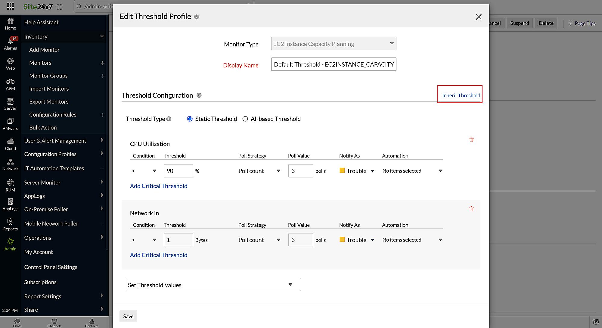 - 在编辑阈值配置文件屏幕中,单击继承阈值。