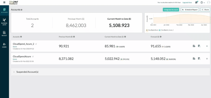 新创建的预算将在 Site24x7 CloudSpend 选项卡的相应部分下显示为子监视器。