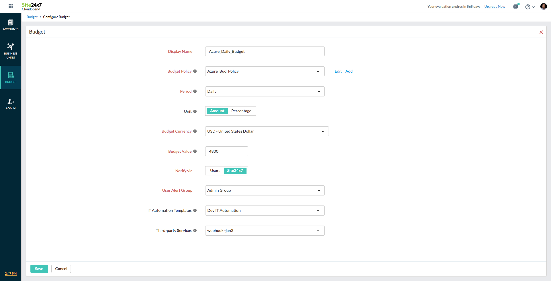 - 每日:通过将期间类型设置为每日,您可以设置每日预算。这可以帮助您检查日常发生的费用。