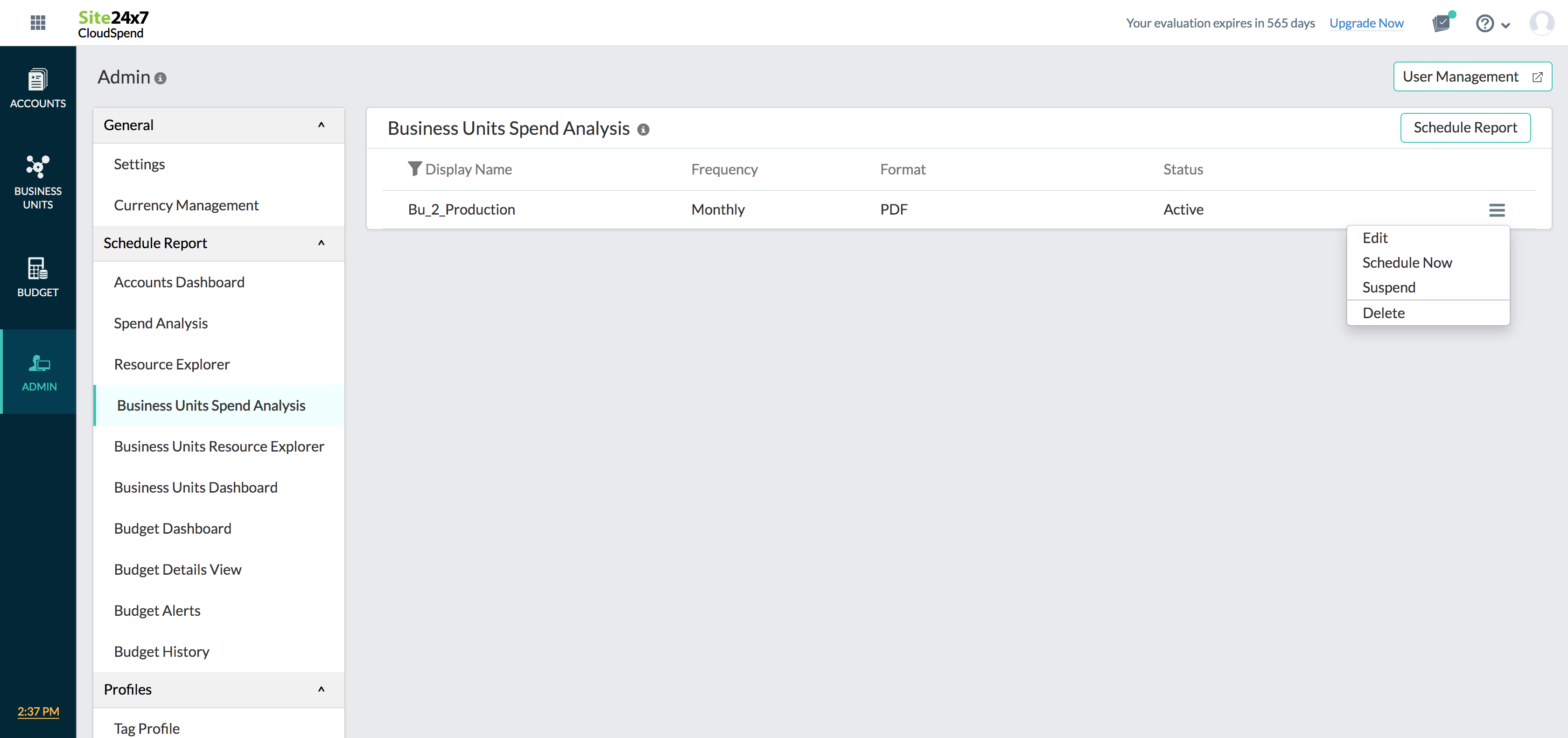 的计划报表功能为您提供了迄今为止已计划的所有报表的概览。您可以每年、每季度或每月从“管理”选项卡为 BU 计划报表。如果您已经为 BU 组、BU Spend Analysis 或 BU Resource Explorer 计划了报表,但想立即计划,请单击图标并选择立即计划。