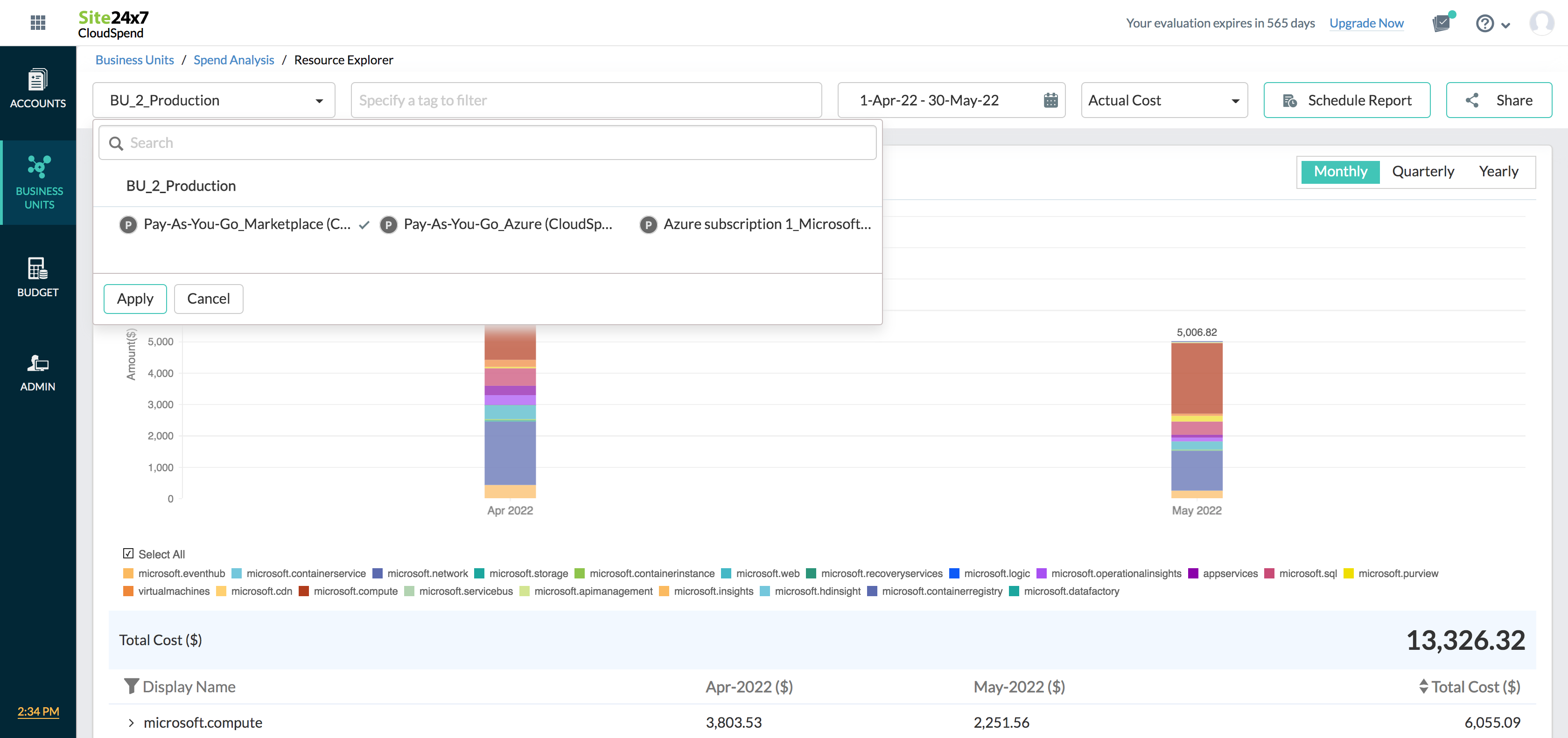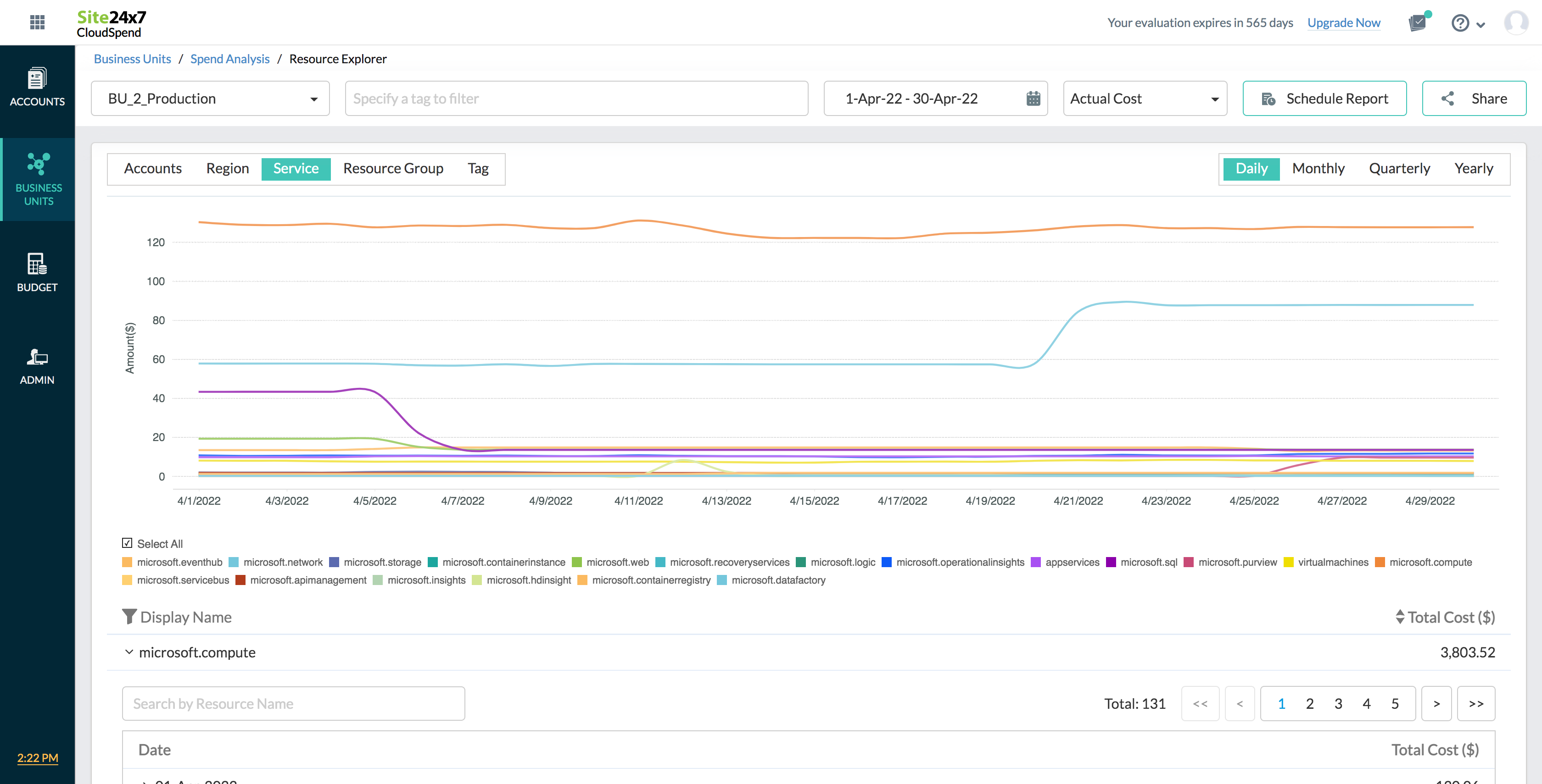BU 资源浏览器为您提供 Azure 资源的聚合视图,这些资源在各个类别中,例如每个 BU 的帐户、区域、服务、资源组或标签。当您在特定 BU的Accounts Splitup视图中选择View Details(如图 2 所示)时,您将被带到Resource Explorer部分。可以每天、每月、每季度或每年查看您的资源级支出的详细细节,并且可以导出为 PDF 或立即通过电子邮件发送。您还可以设置自定义持续时间并查看成本数据。详细了解如何为 Resource Explorer 计划成本和使用情况报表。