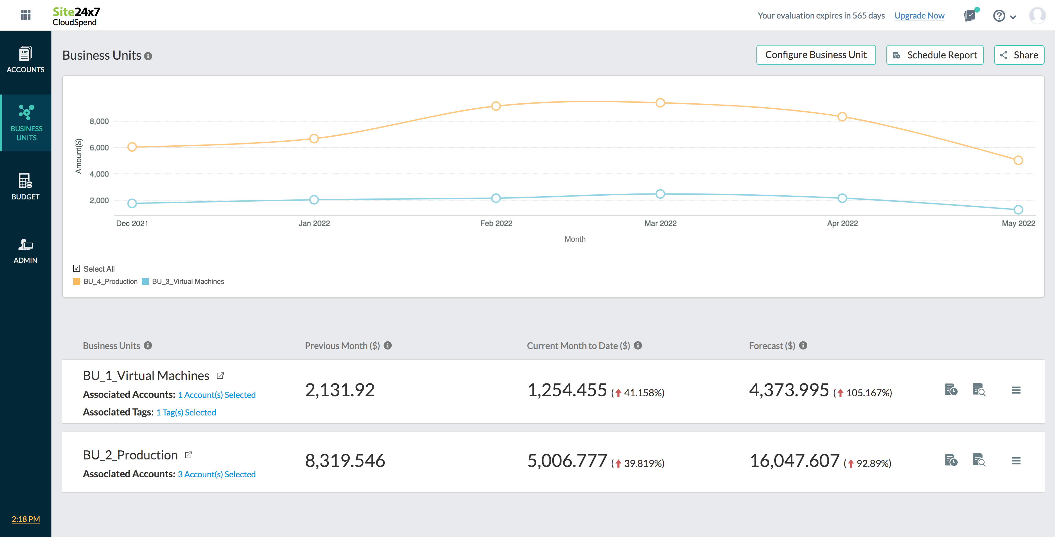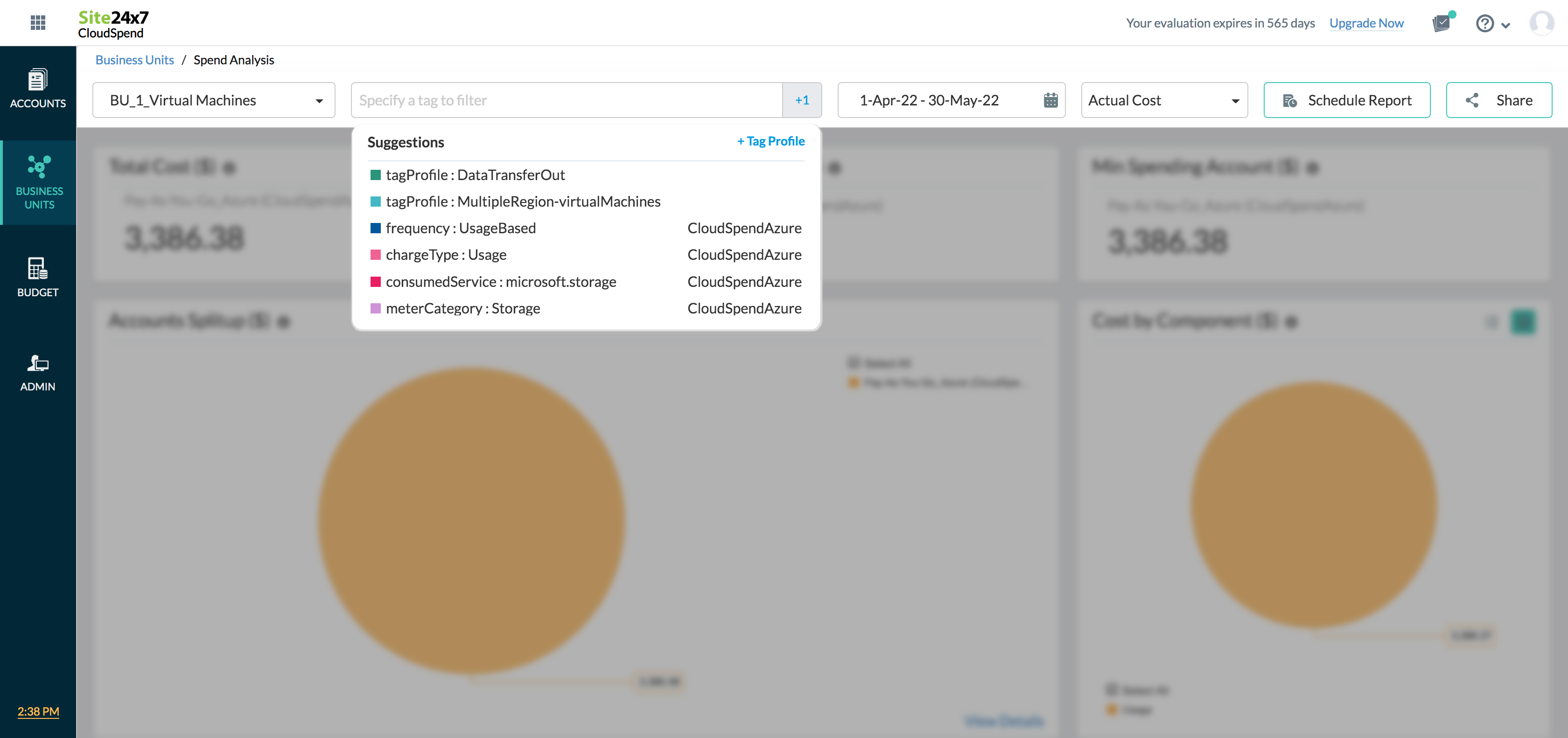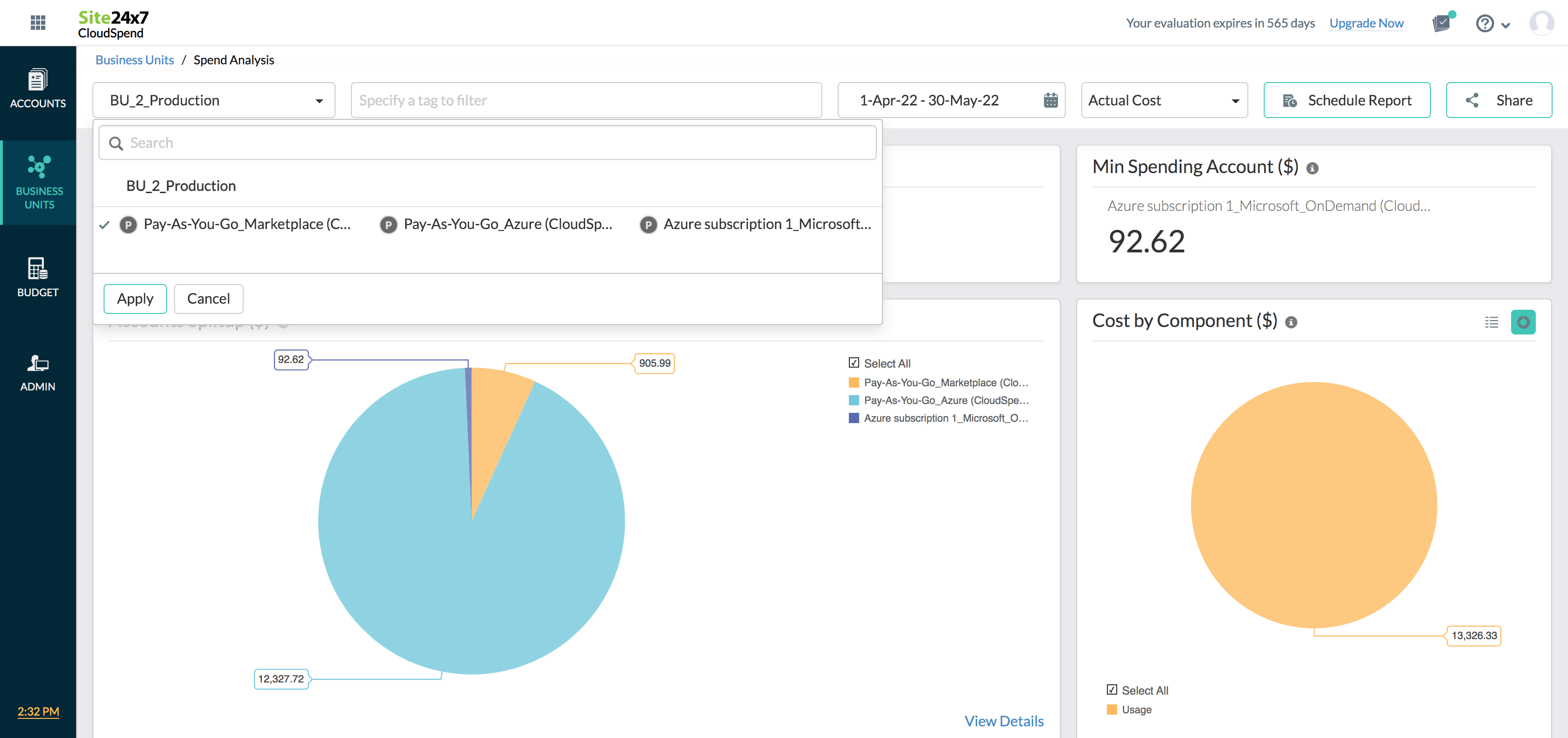 支出分析为您提供按服务、帐户、区域、组件、趋势和资源划分的成本信息。当您从仪表板中选择特定的 BU(如图 1 所示)时,您将被带到您的 BU 的“支出 分析”部分,其中提供了有关应计总成本、最大支出帐户和最小支出帐户的详细信息。您还可以设置自定义持续时间并查看成本数据。详细了解如何计划成本和使用报表以进行 BU 支出分析。