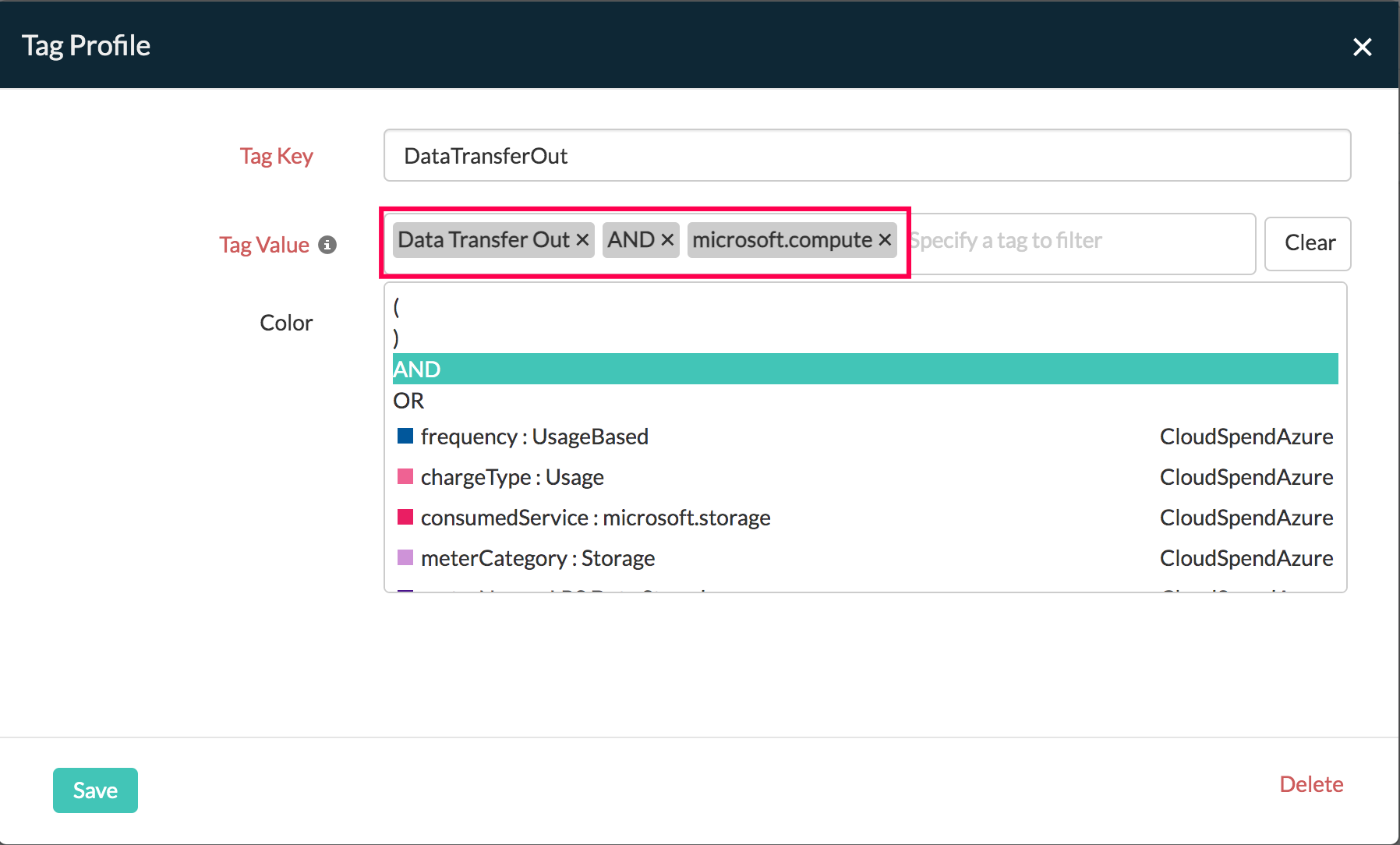 假设您要使用 DataTransferOut 标记键过滤具有两个标记的计算服务数据,以获取您偏好的帐户。在这种情况下,让我们使用meterName:Data Transfer Out标记和consumedService:microsoft.compute标记。这里使用了 AND 条件,以便根据meterName和consumedService标签应用过滤器。