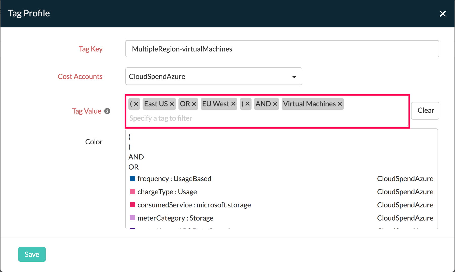 在这种情况下,我们将这些标签输入为: (r esourceLocation:East US OR resourceLocation:EU West ) AND MeterCategory:Virtual Machines。在此示例中,应用程序将显示适用帐户的resourceLocation:East US或resourceLocation:EU West的数据和meterCategory:Virtual Machines的数据。