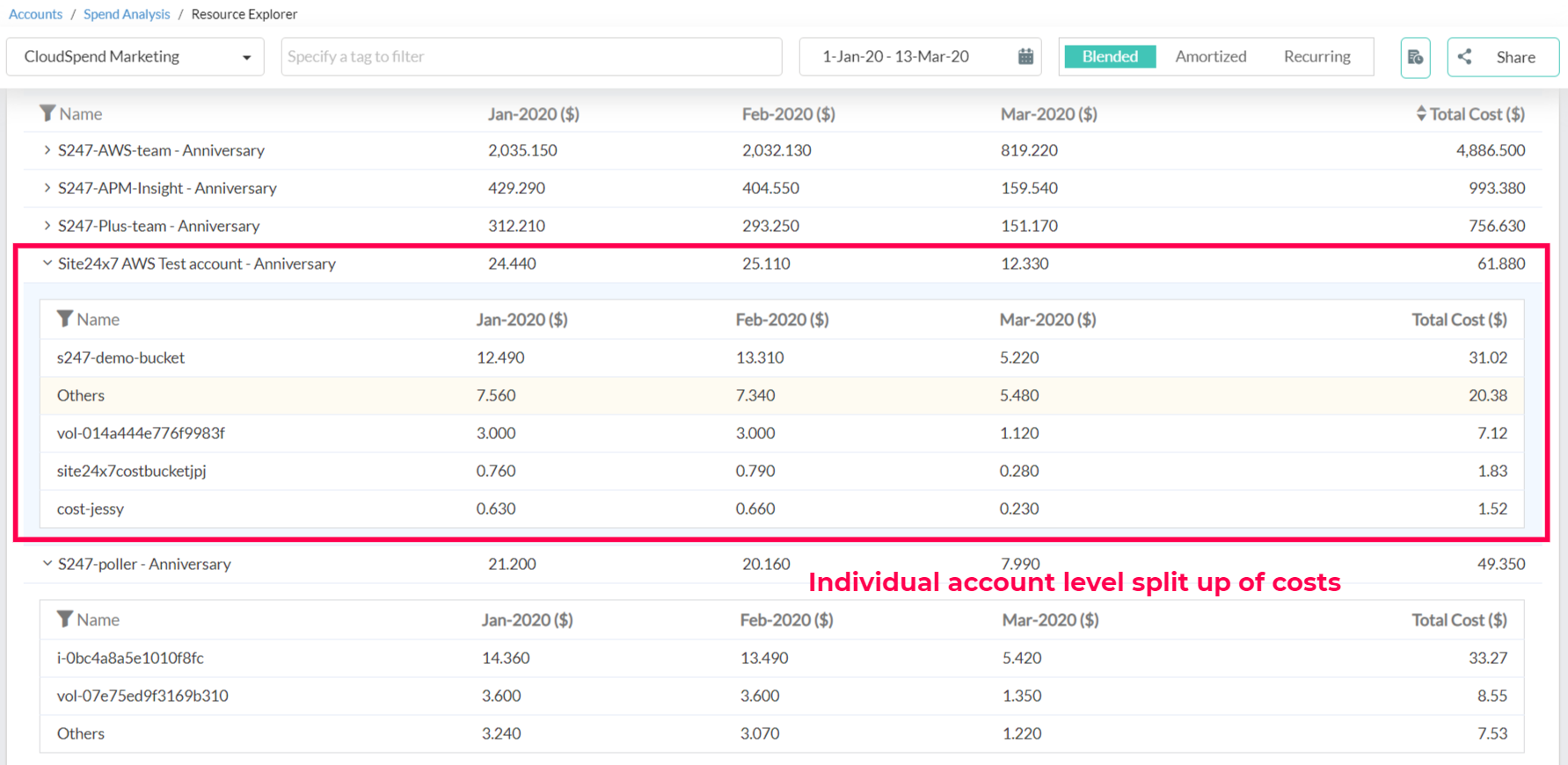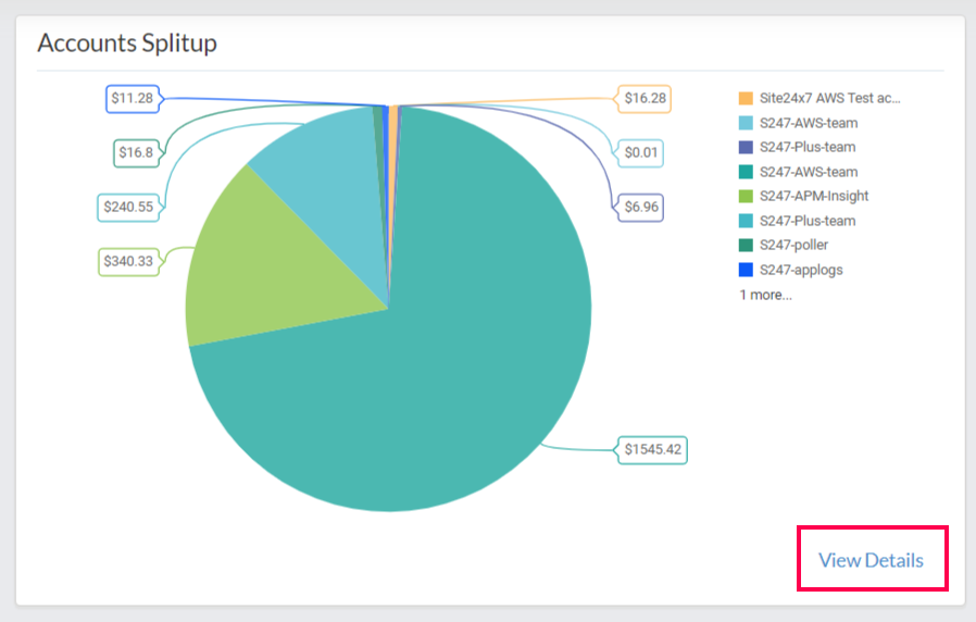 Accounts Splitup 视图根据添加到 CloudSpend 的各种计费帐户提供云成本。从 支出分析选项卡,导航到 帐户拆分部分,然后单击查看详细信息以访问资源浏览器。