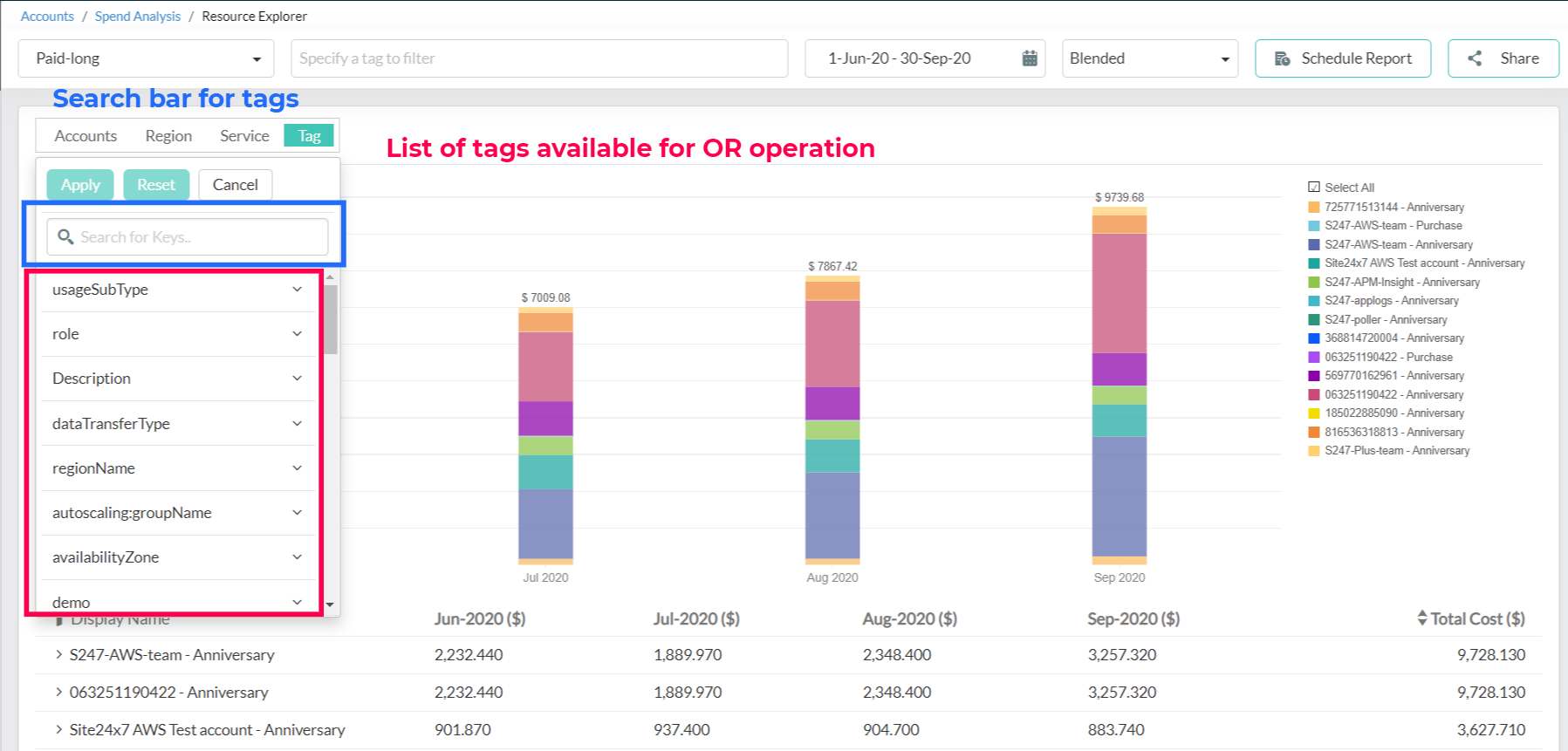 - 标签:AND操作:顶部标签字段可用于指定基于默认属性的标签,例如使用类型、服务名称、操作类型、使用信息、区域名称、创建者、名称、实例类型、用户、可用区、和数据传输类型。这些标签可以组合使用以执行 AND 操作并检索帐户、区域或服务的成本。此外,您可以通过单击右上角的+标签配置文件来添加或编辑自定义标签 。