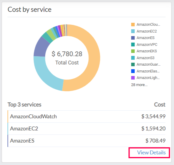 按服务划分的成本视图显示产生最高 AWS 费用的前三项服务。将鼠标悬停在饼图上显示的每项服务上方时,您可以看到按服务划分的成本。从 Spend Analysis选项卡,导航到 Cost by service部分,然后单击View Details。这为您提供 AWS 基础设施中所有服务的整体视图以及每个月的相应账单。