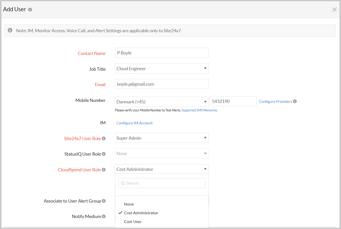 首次,Site24x7 用户角色必须是超级管理员才能访问 CloudSpend 控制台、添加新用户或向其他用户提供基于角色的访问权限。当 Site24x7 用户角色为 Admin 时,所有上述权限将首次受到限制。