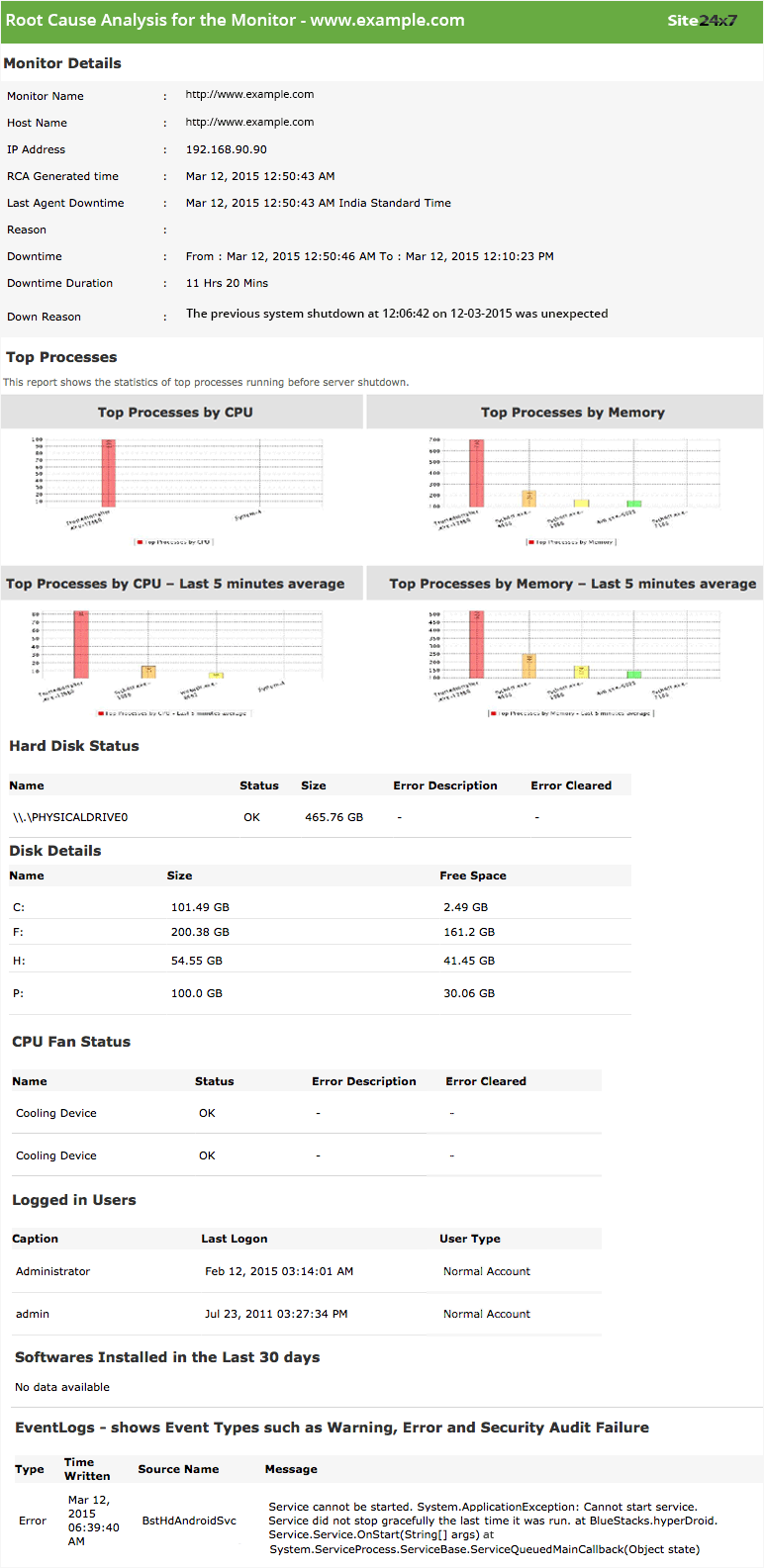 服务器停机期间生成的 RCA 报表的电子邮件示例