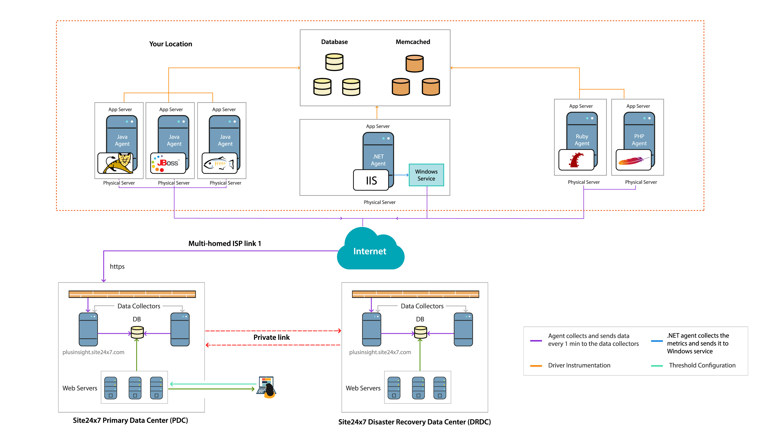 Site24x7 APM Insight Agent 需要下载并安装在每个应用服务器上。数据收集通过单向 HTTPS 连接每分钟进行一次,收集的数据被推送到 Site24x7 数据收集器。这也确保了代理与服务器之间的不间断通信。在 .NET 代理的情况下,代理将收集到的指标发送到 Windows 服务,后者又将数据推送到数据收集器。使用这些数据,用户可以跟踪应用程序响应时间、识别慢速数据库查询、吞吐量、使用 Apdex 分数衡量用户满意度、隔离代码中的慢速调用并跟踪单个方法跟踪等。