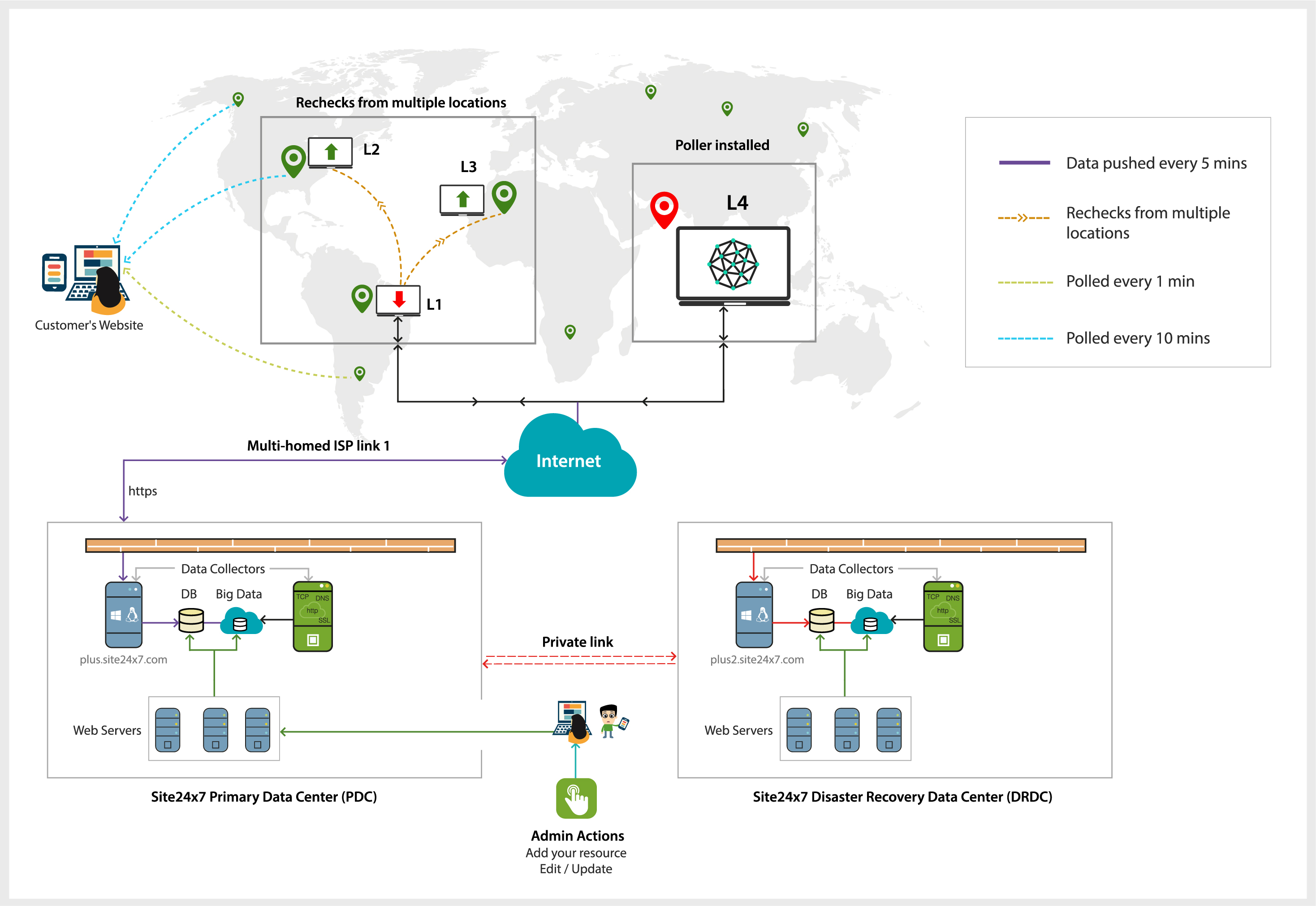 现在使用这些全球监控位置,Site24x7 通过从配置的主要和次要位置进行监控来通知网站状态。主要位置是根据设置的轮询间隔轮询已注册监视器的主要位置。如果检测到您的监视器在主要位置出现故障,Site24x7 服务器会从选定的辅助位置进行检查,并在出现停机时发出通知。