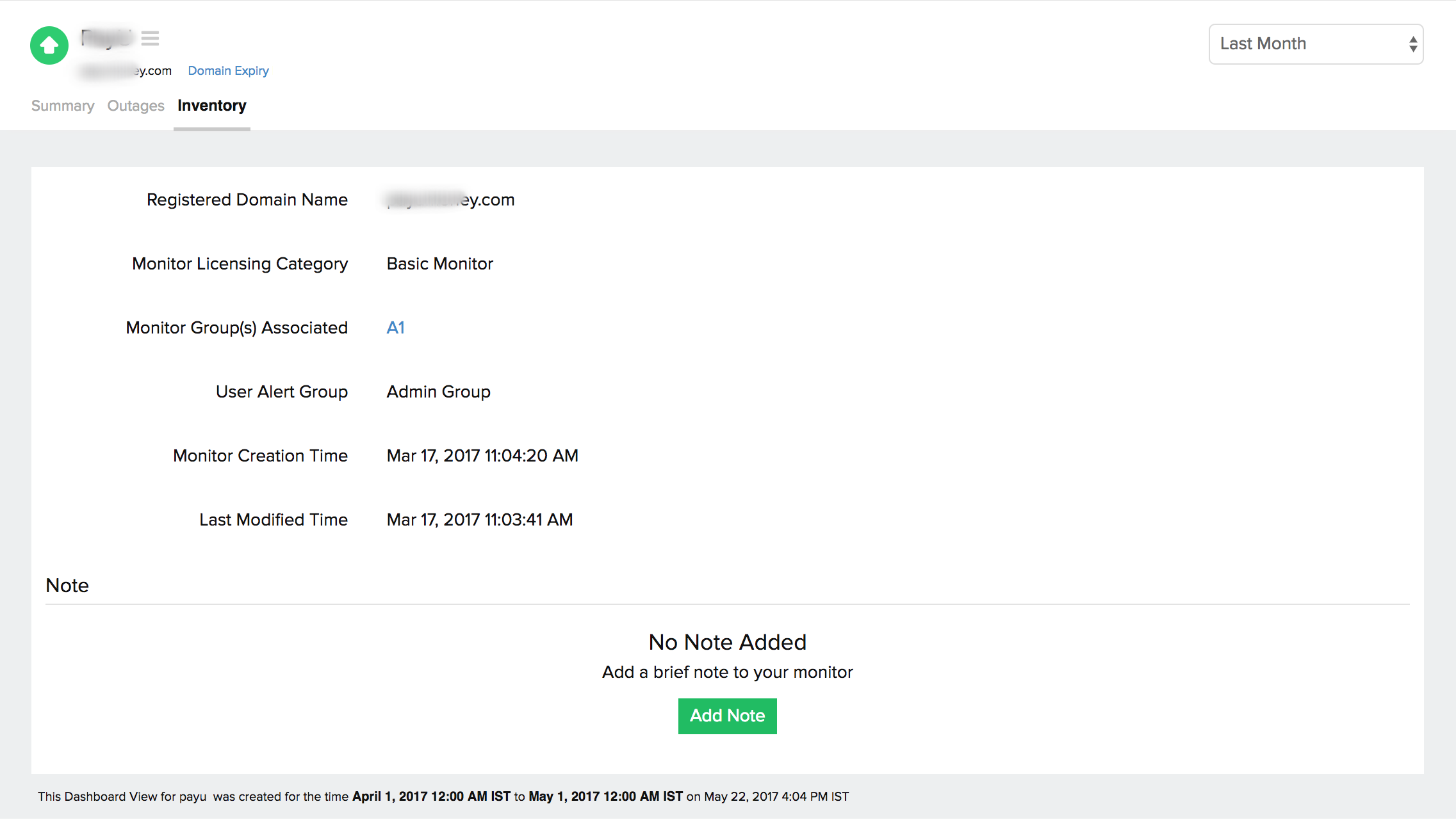 此仪表板捕获基本的监视器清单详细信息,例如注册域名、监视器许可类别、关联的监视器组、监视器创建时间、上次修改时间。监视器状态消息将作为注释自动登录。任何用户评论也将显示在注释部分。