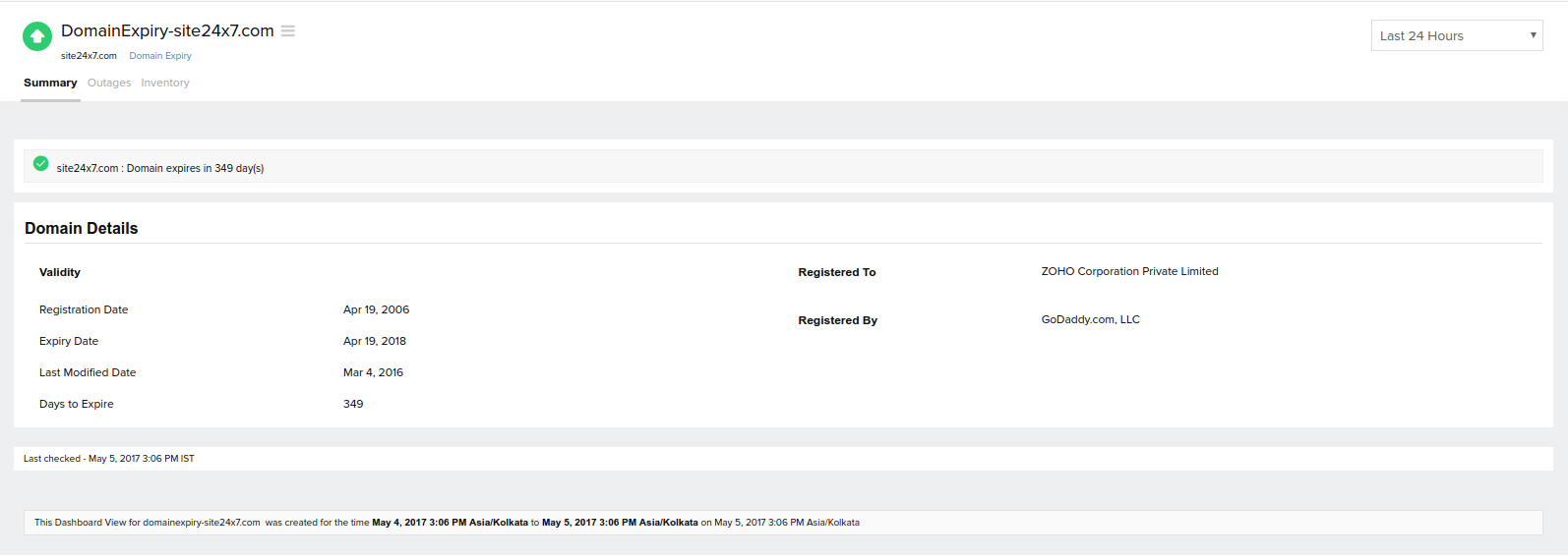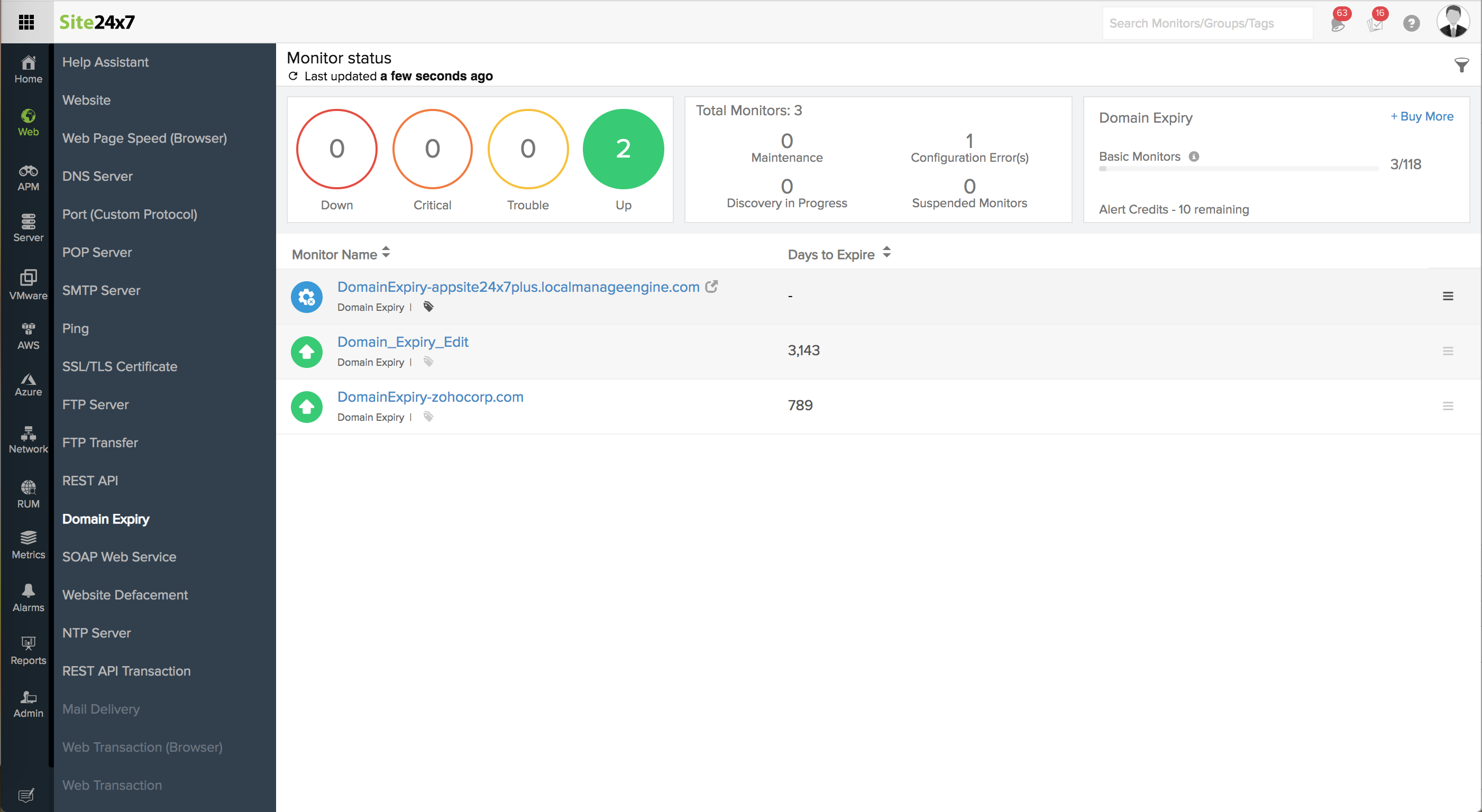 Site24x7 的域名到期监控会在您的域名到期之前的预设时间段内持续检查并提醒您。这样, 您可以确保您能够提前更新您的域地址并保持其所有权。