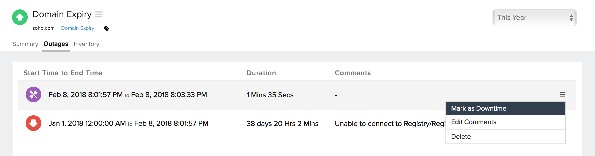 您可以访问监视器详细信息页面中的“中断”选项卡,以收集有关各种中断和维护停机时间的详细见解。它为您提供了足够的信息来解决问题。您还可以访问各种中断的根本原因分析报表。在访问