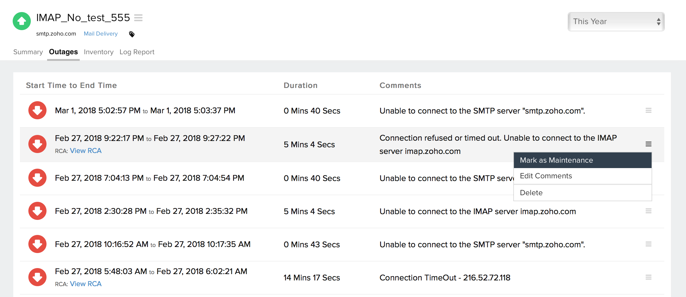 您可以访问监视器详细信息页面中的“中断”选项卡,以收集有关各种中断和维护停机时间的详细见解。它为您提供了足够的信息来解决问题。您还可以访问各种中断的根本原因分析报表。在访问