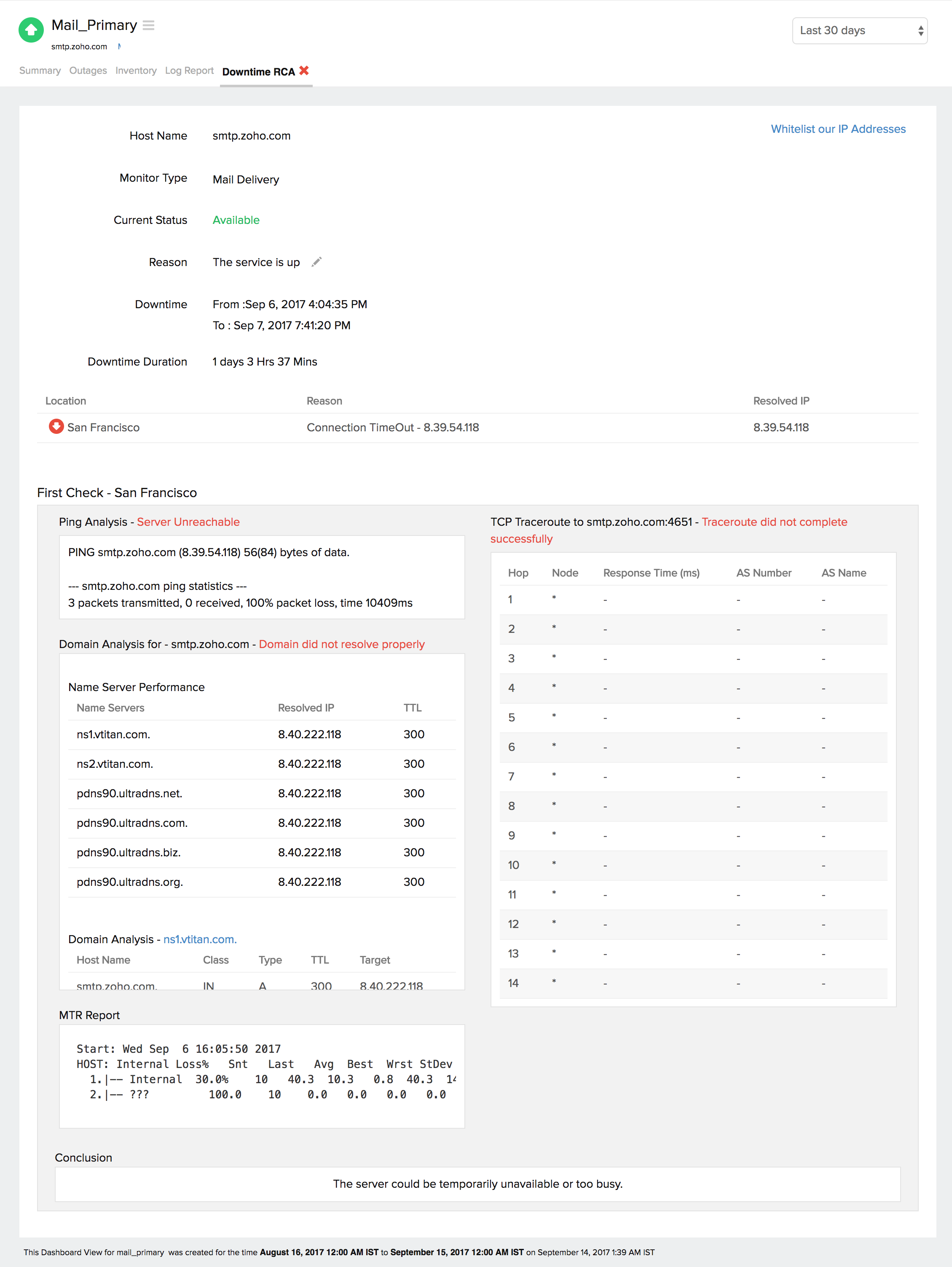 在监视器报告中断 150 秒后,您可以检索停机监视器的深入根本原因分析报表。RCA 报表提供有关您的监视器的基本详细信息、停机详细信息、重新检查详细信息和停机原因。根本原因分析会自动生成大量信息,以得出关于什么触发了停机时间的明确结论。RCA 打算确定特定停机时间或性能问题的根本原因。正常的 RCA 报表将包含以下详细信息: