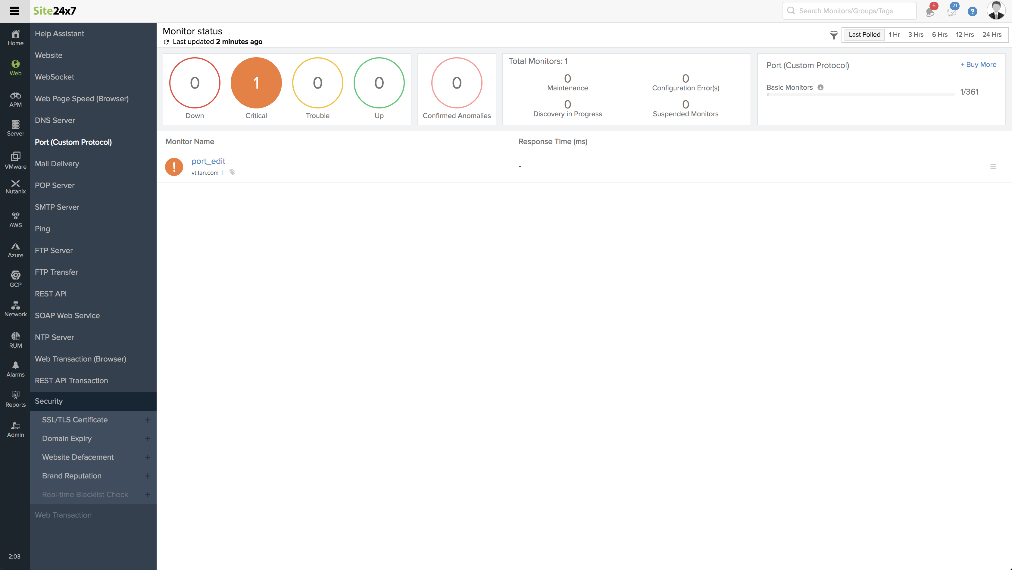 Site24x7 的 Web 仪表板有一个自定义状态横幅,它通过根据运行状态和状态将它们隔离来识别各种配置的监视器。您还可以查看帐户中剩余的操作监视器和告警信用的数量。通过单击“+购买更多”按钮,您可以购买额外的监视器和告警点数。您可以通过电子邮件共享监视器详细信息。电子邮件只能发送给那些同意从 Site24x7 接收电子邮件的经过验证的用户。