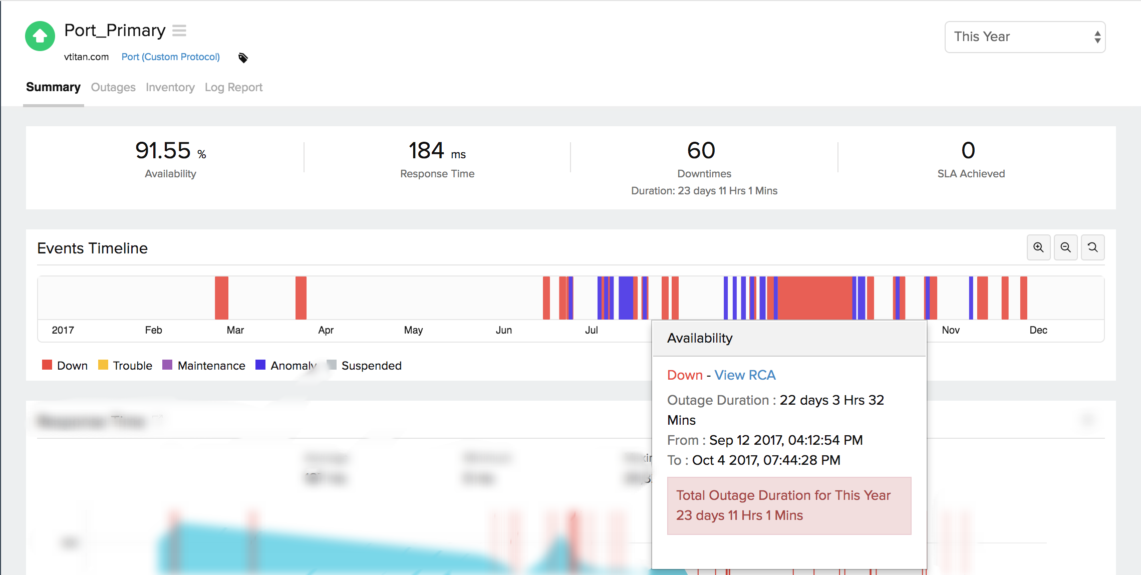 事件时间线小窗件记录所选监视器在选定时间范围内的所有过去事件。您可以识别/解码过去的各种事件,包括停机、严重、故障、维护、暂停或异常。每个事件都有颜色编码,便于识别。可以深入挖掘事件以提取最大数据并便于故障排除。您还可以跟踪特定时间段内的实际中断期和总中断持续时间。