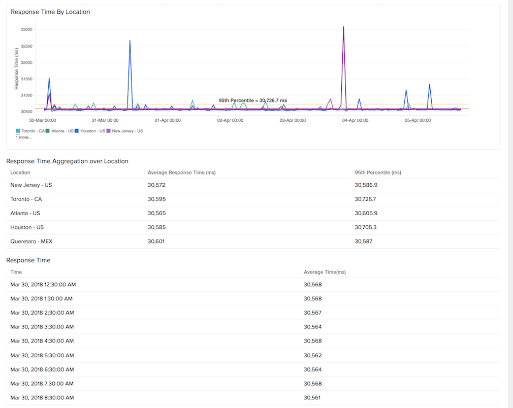按位置的响应时间图给出了从每个监控位置每天或每小时连接到端口所需的中位时间。此图可用于分析来自不同监控位置的端口(自定义协议)监视器的平均/第 95 个百分位响应时间。使用图表下方给出的图例标识位置。