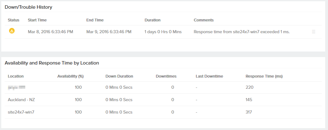 每个监控位置的端口的可用性和响应时间以表格格式表示。可以从该数据中推断出每个监控位置的总可用性百分比和响应时间(毫秒)以及停机时间。