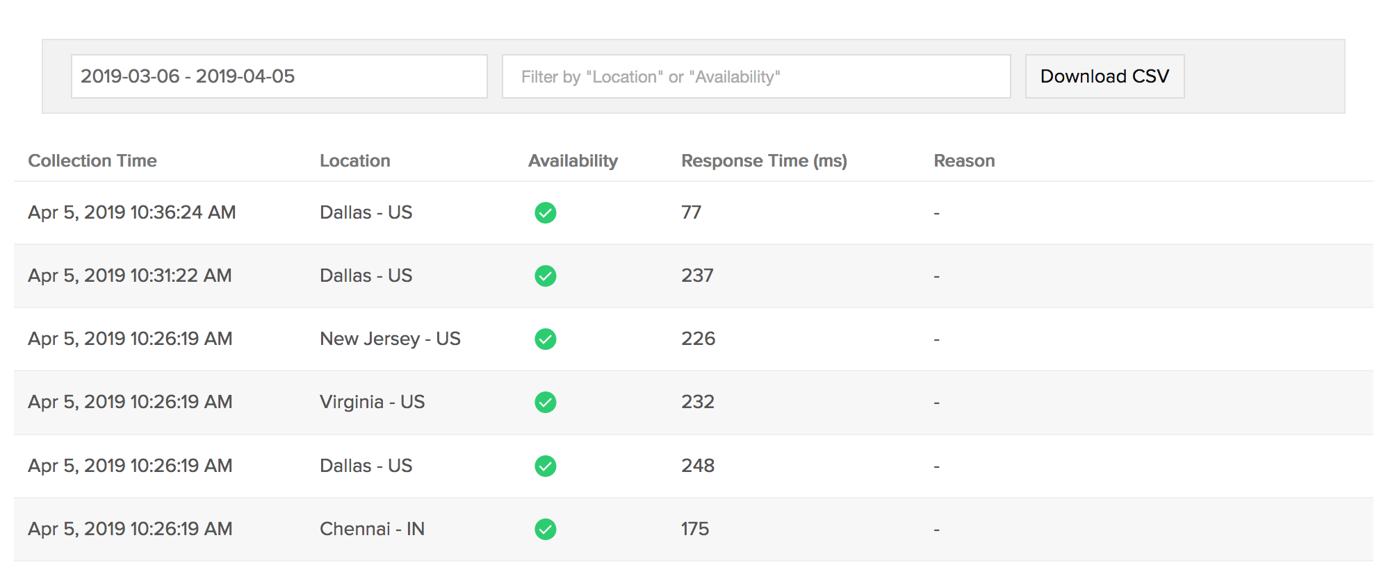 通过我们针对单个监视器的集成日志记录,您可以深入了解已配置监视器在自定义时间段的各种日志详细信息。您还可以根据位置和可用性过滤日志。您可以选择以 CSV 格式下载日志报表。