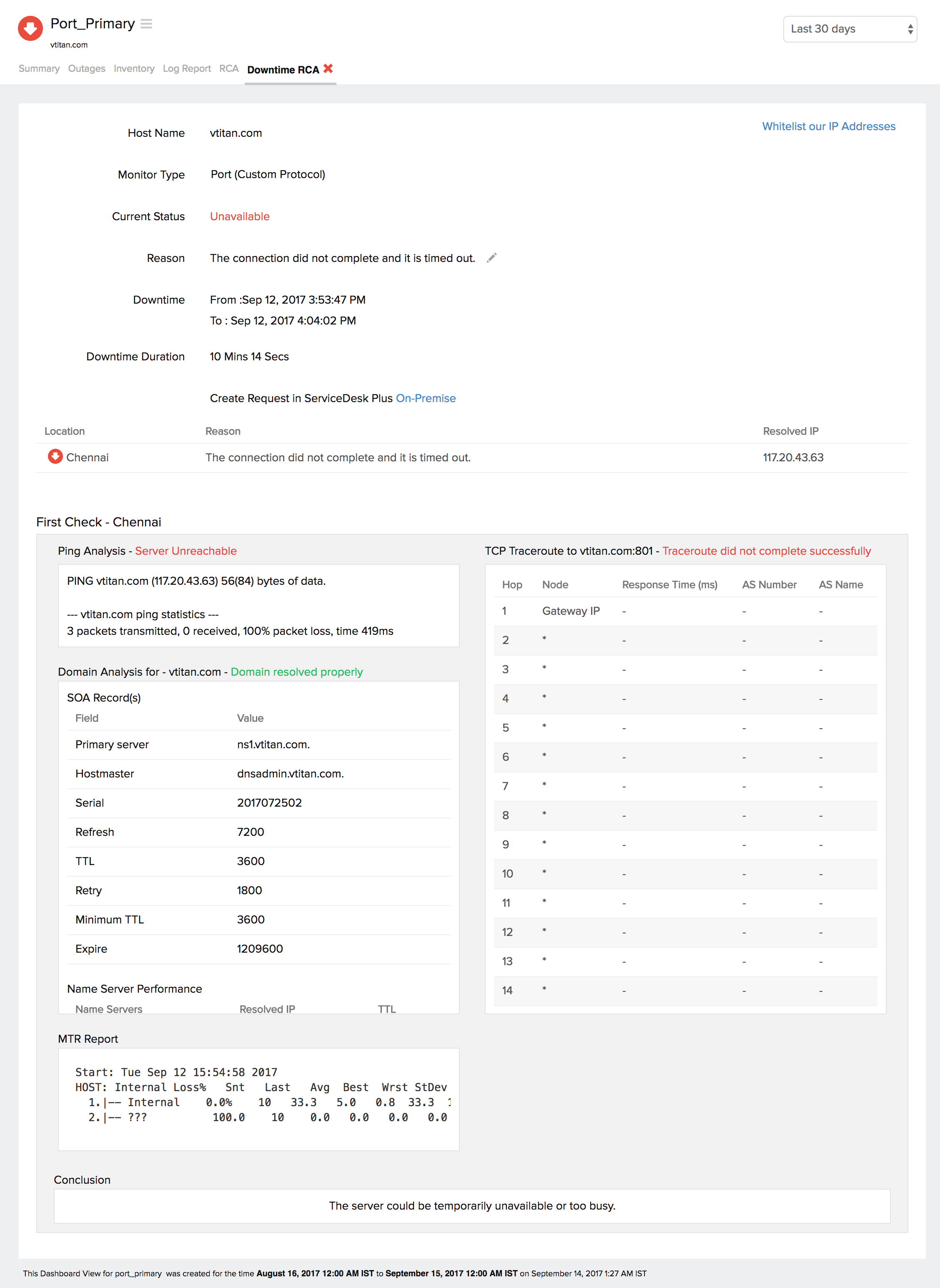 在监视器报告中断 150 秒后,您可以检索停机监视器的深入根本原因分析报表。RCA 报表提供有关您的监视器的基本详细信息、停机详细信息、重新检查详细信息和停机原因。根本原因分析会自动生成大量信息,以得出关于什么触发了停机时间的明确结论。RCA 打算确定特定停机时间或性能问题的根本原因。正常的 RCA 报表将包含以下详细信息: