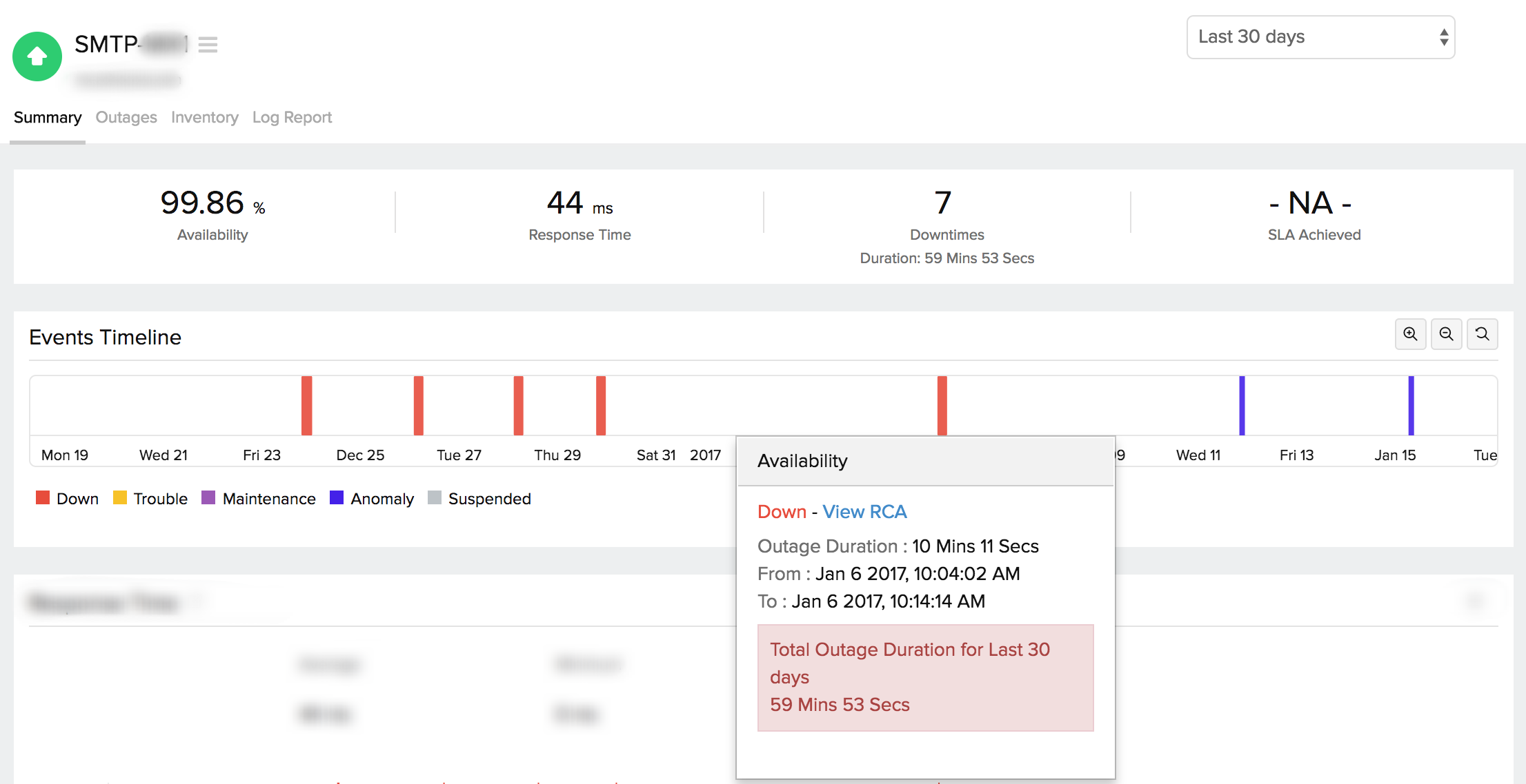 事件时间线小窗件记录所选监视器在选定时间范围内的所有过去事件。您可以识别/解码过去的各种事件,包括停机、严重、故障、维护、暂停或异常。每个事件都有颜色编码,便于识别。可以深入挖掘事件以提取最大数据并便于故障排除。您还可以跟踪特定时间段内的实际中断期和总中断持续时间。