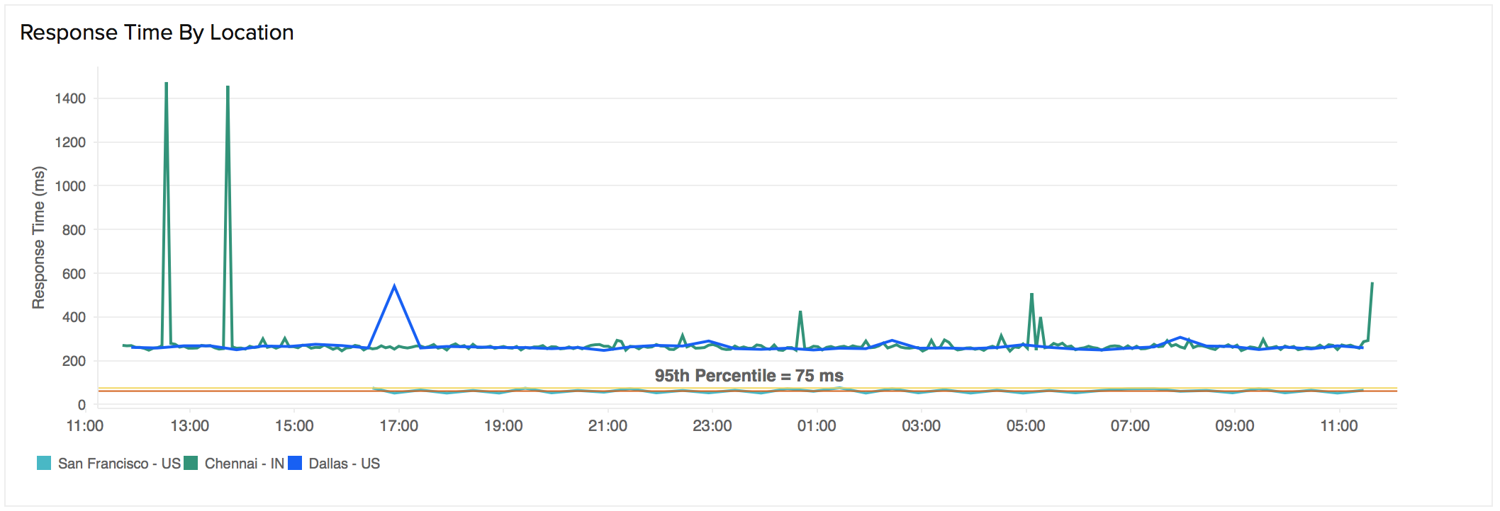 响应时间(按位置)图表显示每个监控位置每天或每小时的平均响应时间。这可用于检查来自不同监视位置的监视器的平均响应时间。位置图例随图表一起提供,便于管理。