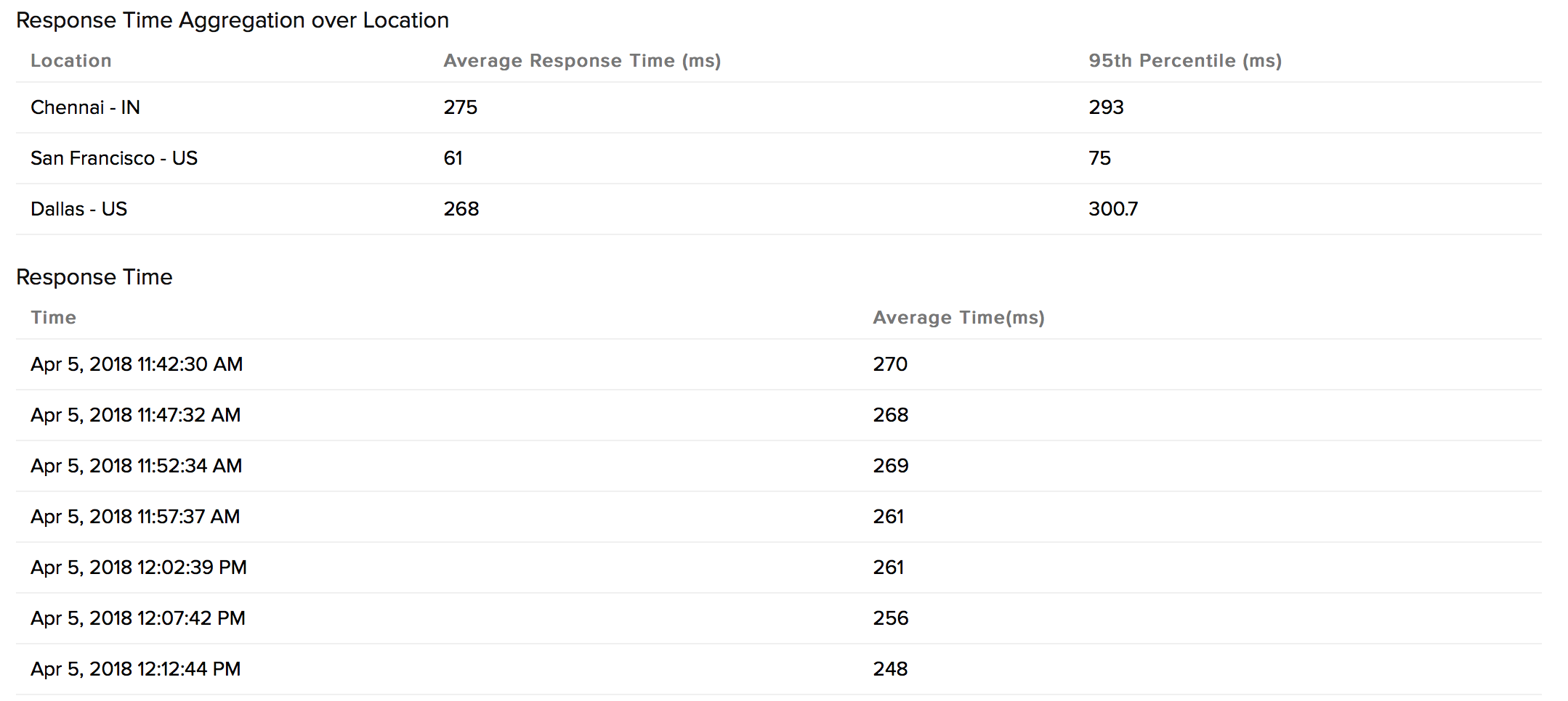 平均响应时间和按位置划分的平均/第 95 个百分位响应时间以表格格式详细说明。