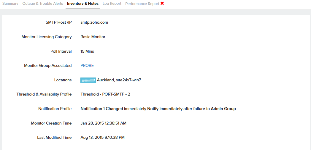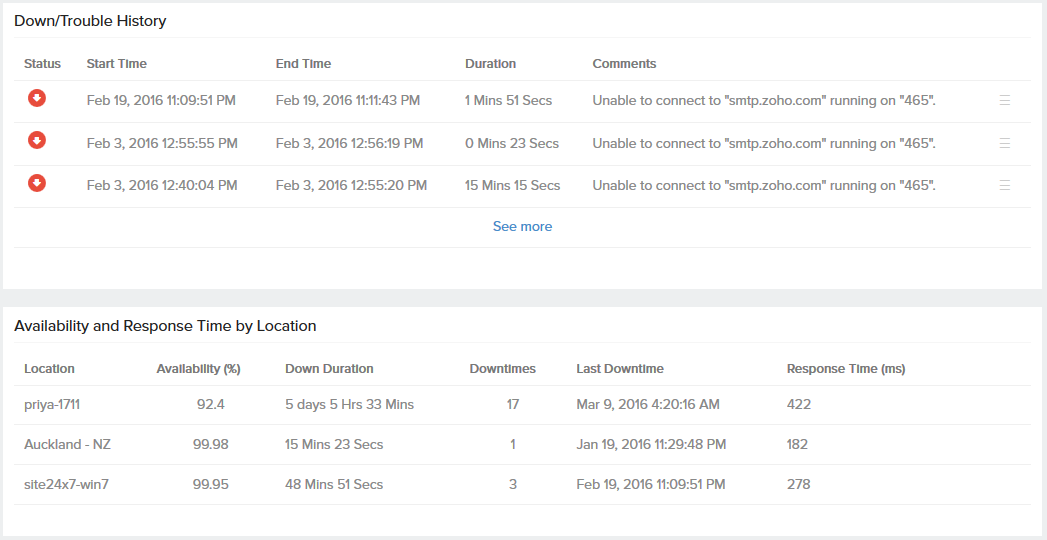 - 按位置的可用性和响应时间,它呈现基于位置的 SMTP 服务器可用性和 SMTP 服务器响应时间的图形和表格报表(以毫秒为单位)。