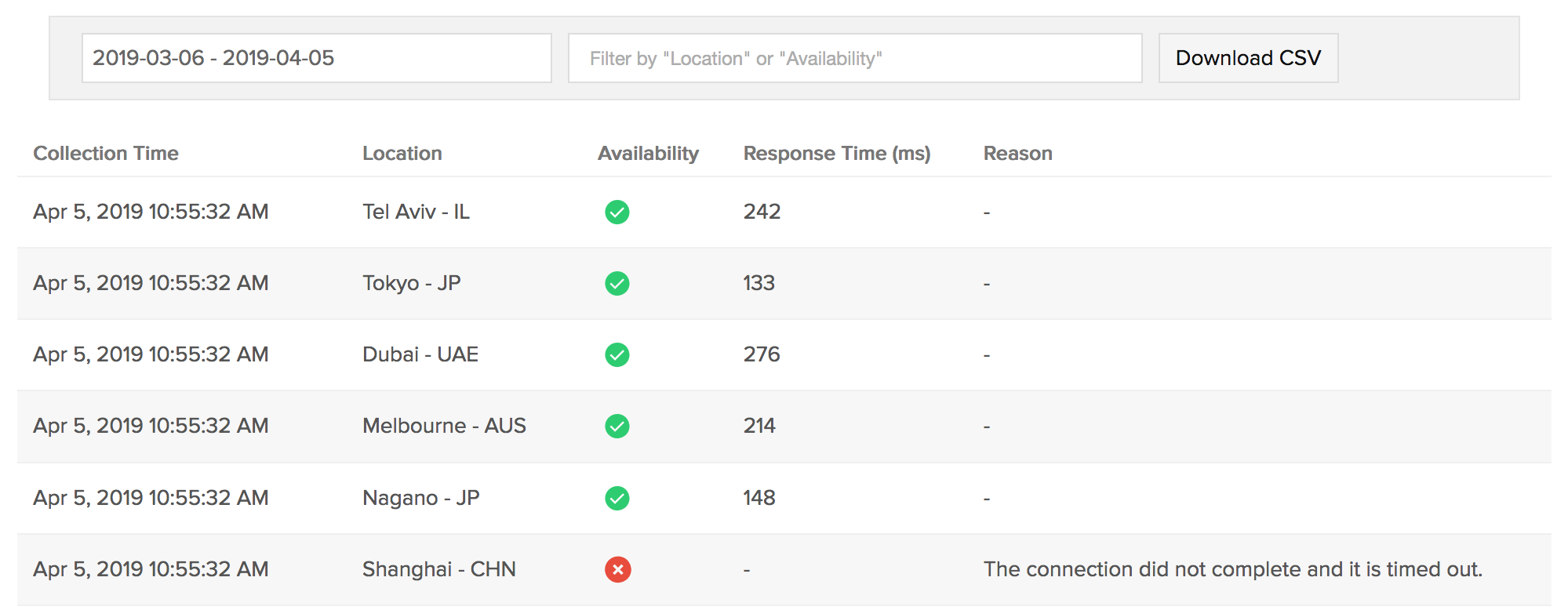 通过我们针对单个监视器的集成日志记录,您可以深入了解已配置监视器在自定义时间段的各种日志详细信息。您还可以根据位置和可用性过滤日志。您可以选择以 CSV 格式下载日志报表。