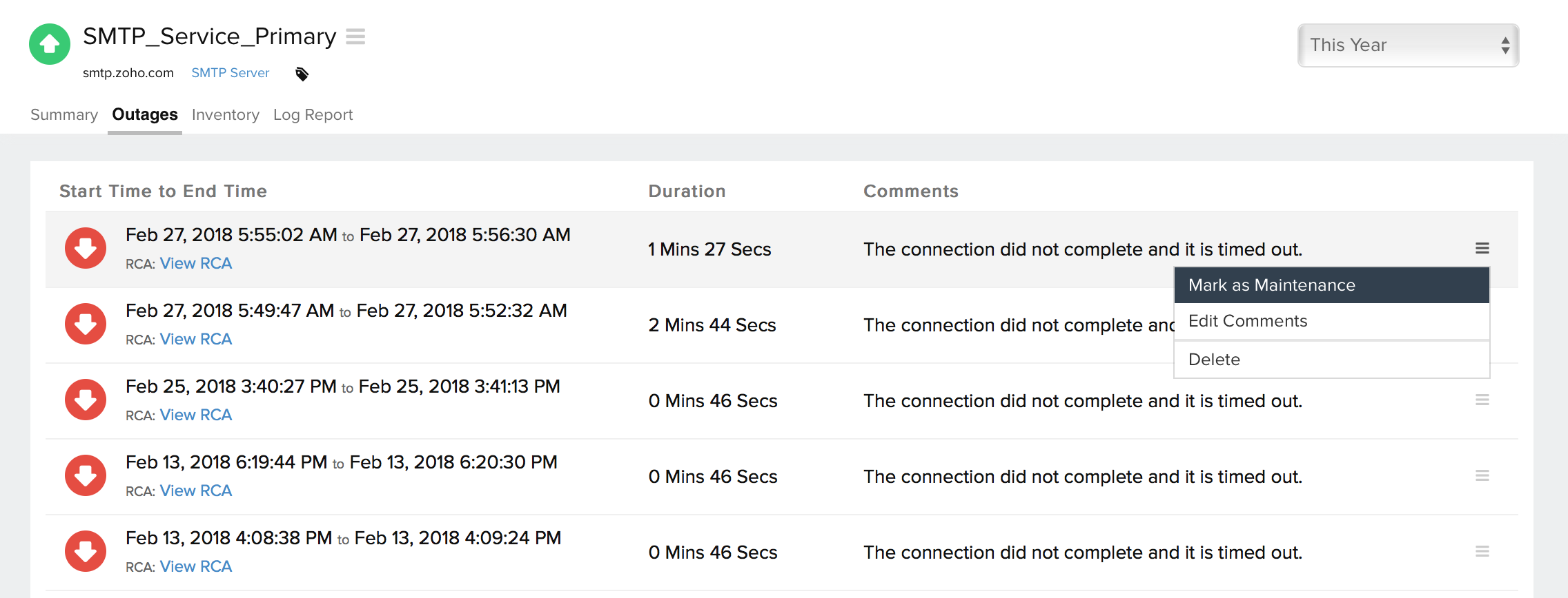 您可以访问监视器详细信息页面中的“中断”选项卡,以收集有关各种中断和维护停机时间的详细见解。它为您提供了足够的信息来解决问题。您还可以访问各种中断的根本原因分析报表。在访问