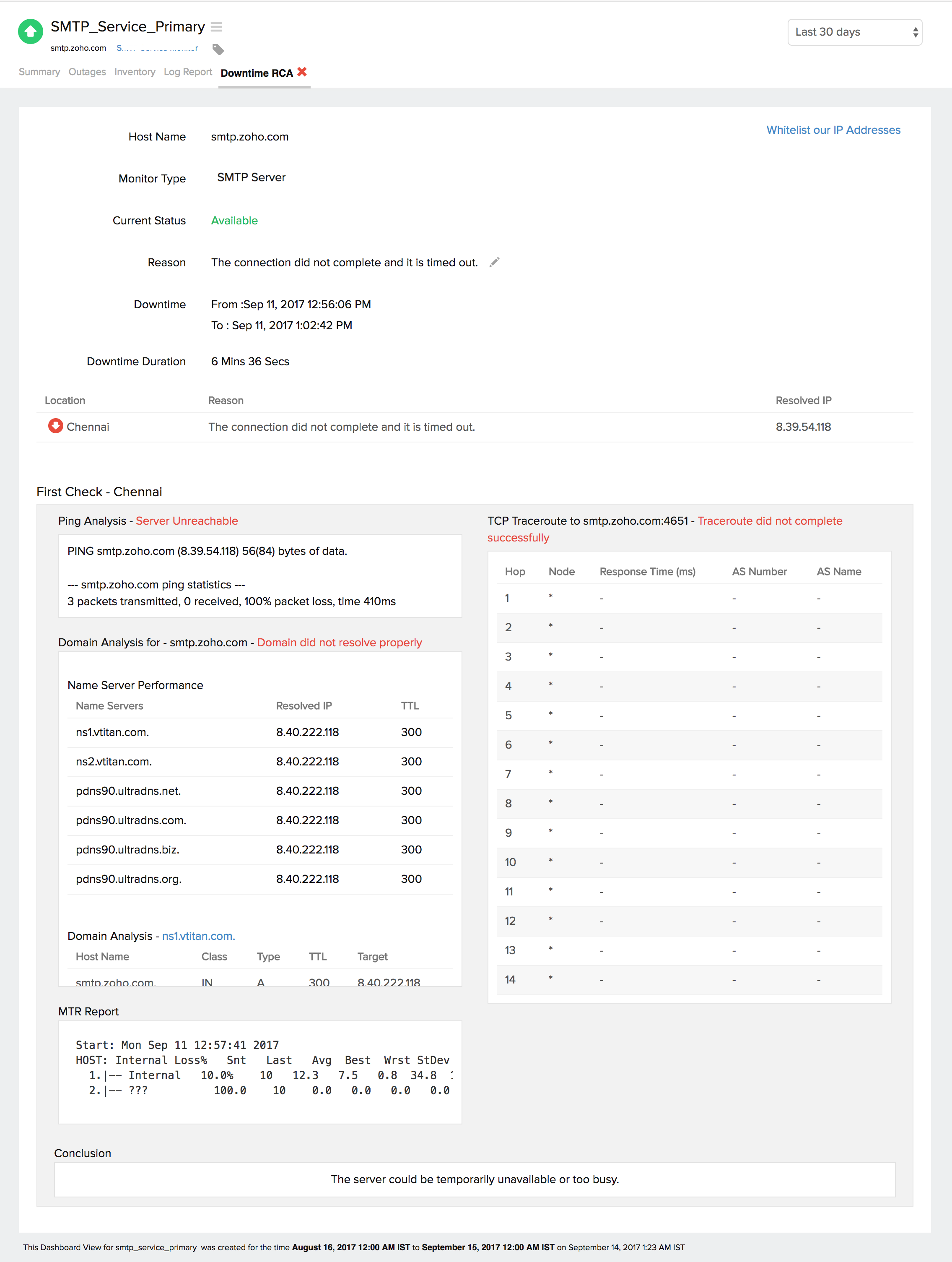 在监视器报表中断 150 秒后,您可以检索停机监视器的深入根本原因分析报表。RCA 报表提供有关您的监视器的基本详细信息、停机详细信息、重新检查详细信息和停机原因。根本原因分析会自动生成大量信息,以得出关于什么触发了停机时间的明确结论。RCA 打算确定特定停机时间或性能问题的根本原因。正常的 RCA 报表将包含以下详细信息: