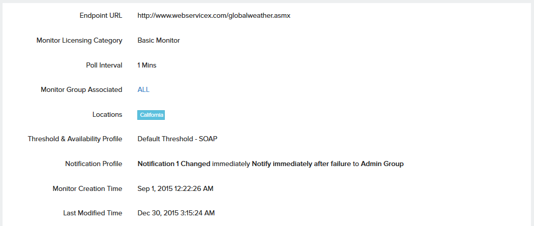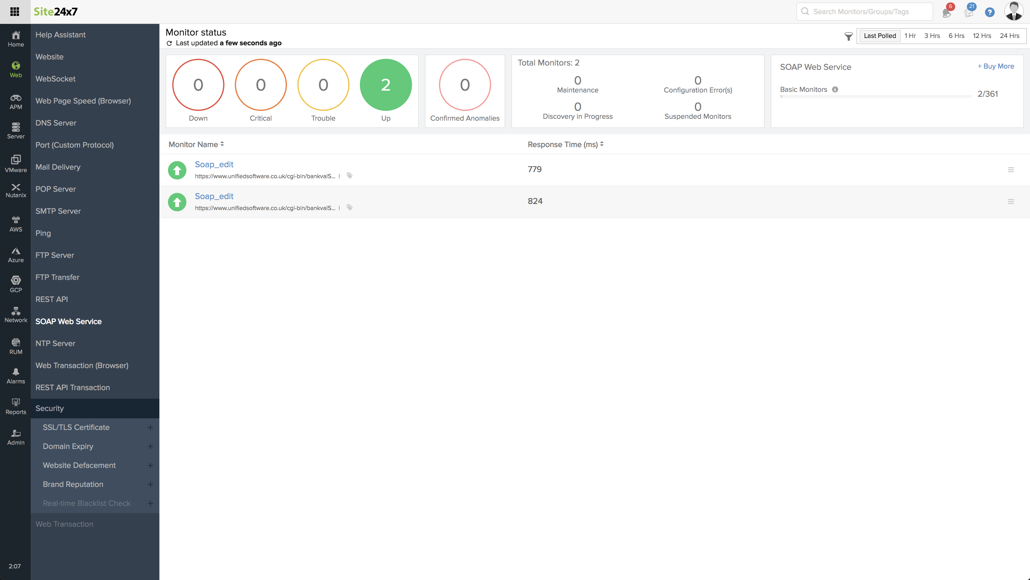Site24x7 的 SOAP Web 服务监视器会定期检查基于 SOAP 的 Web 服务的可用性和性能。当响应 (XML) 不具有指定的 SOAP 属性名称或响应验证中提供的 SOAP 属性值未根据其对应的 SOAP 属性名称进行验证时,它会提醒您。导航到 Web 图标并单击所需的 SOAP Web 服务监视器,以深入分析基于 SOAP 的 Web 服务的操作。