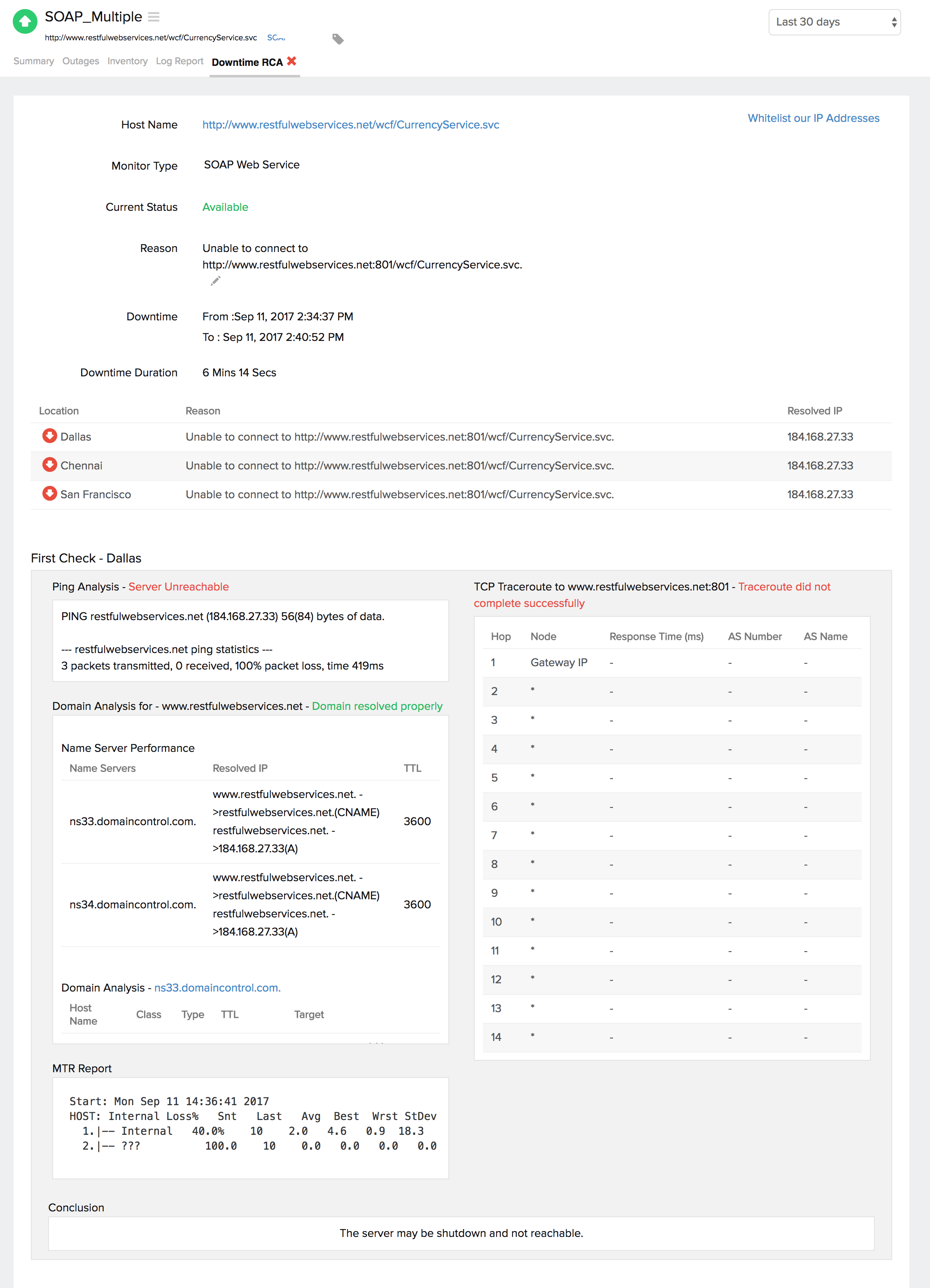 在监视器报告中断 150 秒后,您可以检索停机监视器的深入根本原因分析报表。RCA 报表提供有关您的监视器的基本详细信息、停机详细信息、重新检查详细信息和停机原因。根本原因分析会自动生成大量信息,以得出关于什么触发了停机时间的明确结论。RCA 打算确定特定停机时间或性能问题的根本原因。正常的 RCA 报表将包含以下详细信息: