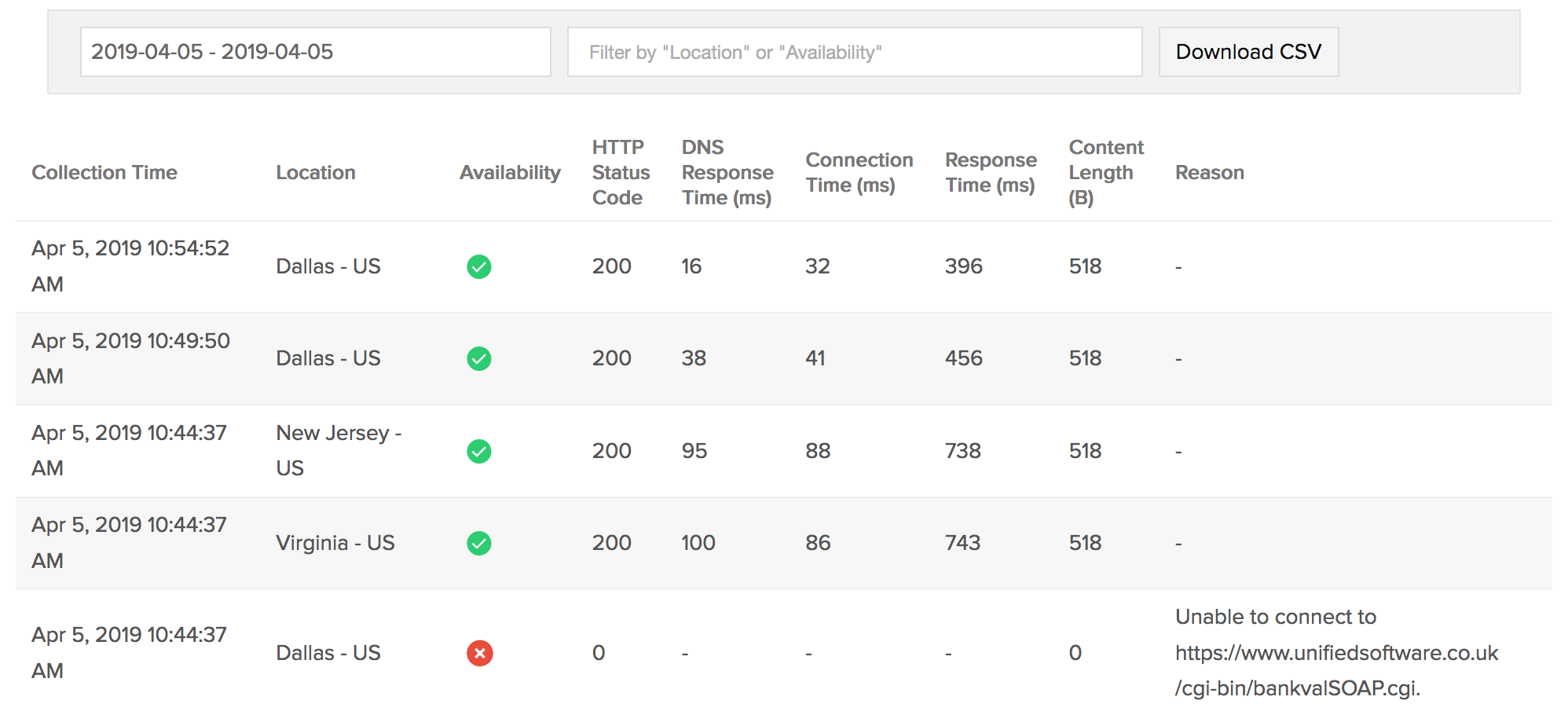通过我们针对单个监视器的集成日志记录,您可以深入了解已配置监视器在自定义时间段的各种日志详细信息。您还可以根据位置和可用性过滤日志。您可以选择以 CSV 格式下载日志报表。