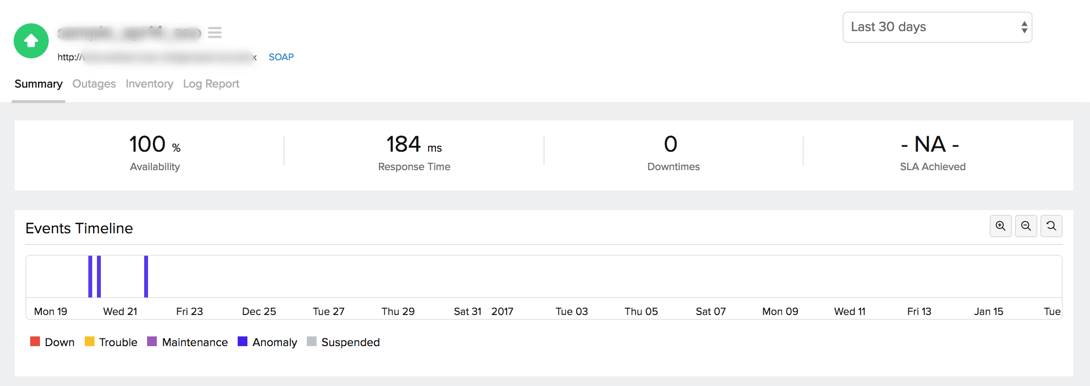 事件时间线小窗件记录所选监视器在选定时间范围内的所有过去事件。您可以识别/解码过去的各种事件,包括停机、严重、故障、维护、暂停或异常。每个事件都有颜色编码,便于识别。可以深入挖掘事件以提取最大数据并便于故障排除。您还可以跟踪特定时间段内的实际中断期和总中断持续时间。