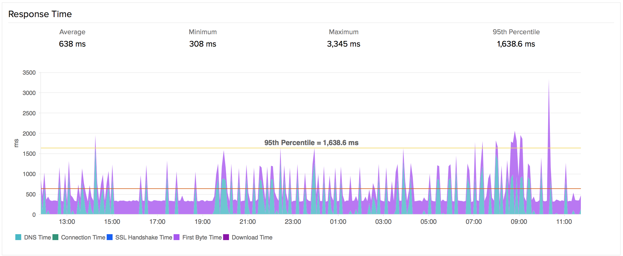 SOAP Web 服务的响应时间计算为 DNS 查找时间、连接时间、SSL 握手时间和接收 XML 格式响应所用时间的累积总和。您的 SOAP Web 服务在选定时间段内跨所有监控位置的响应时间是使用面积图计算和显示的,每个性能属性都根据图表下方显示的图例进行分段。您可以通过选择适当的图例进一步过滤掉三点、五点移动平均线以及 95 个百分位数。该图表还允许您放大并从图形峰值中分离出确切的数据。您还可以添加特定注释以通知用户有关各种中断和维护活动的信息。
