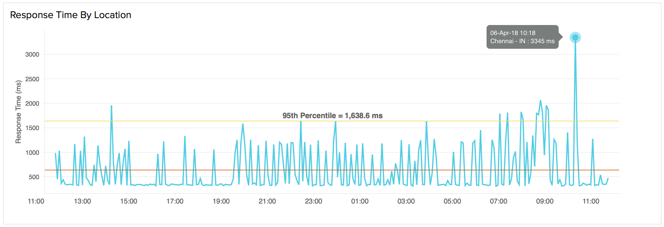 响应时间(按位置)图表显示每个监控位置每天或每小时的平均/第 95 个百分位响应时间。这可用于检查来自不同监视位置的监视器的平均响应时间。位置图例随图表一起提供,便于管理。
