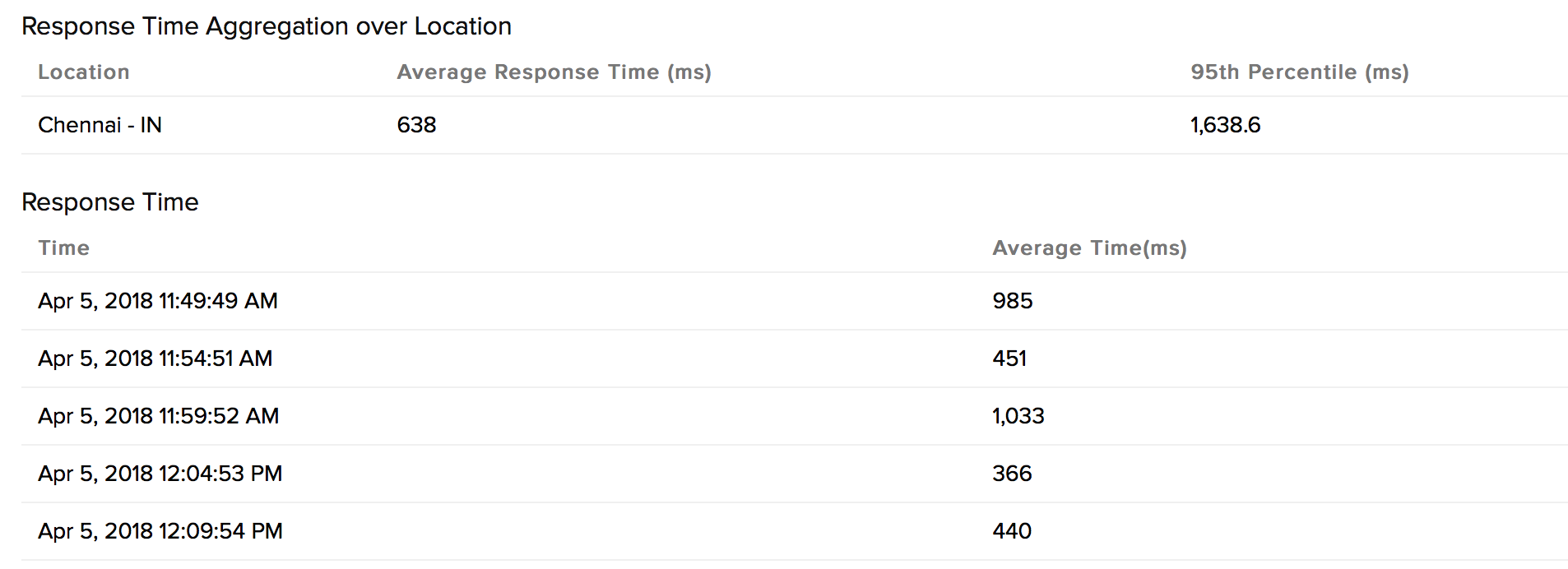 - 响应时间:获取 XML 响应所需的总时间。它是各种属性的总和,例如 DNS 查找时间、连接时间、SSL 握手时间、首字节时间和 XML 响应的下载时间。