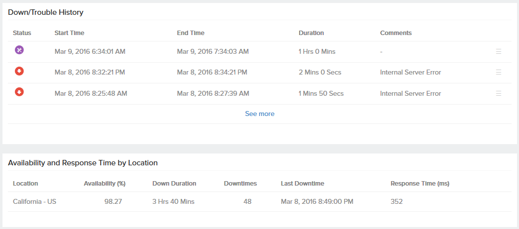 它提供了对监视器故障历史的详细了解。您可以查看状态、确切的停机时间、持续时间和停机状态的具体原因。