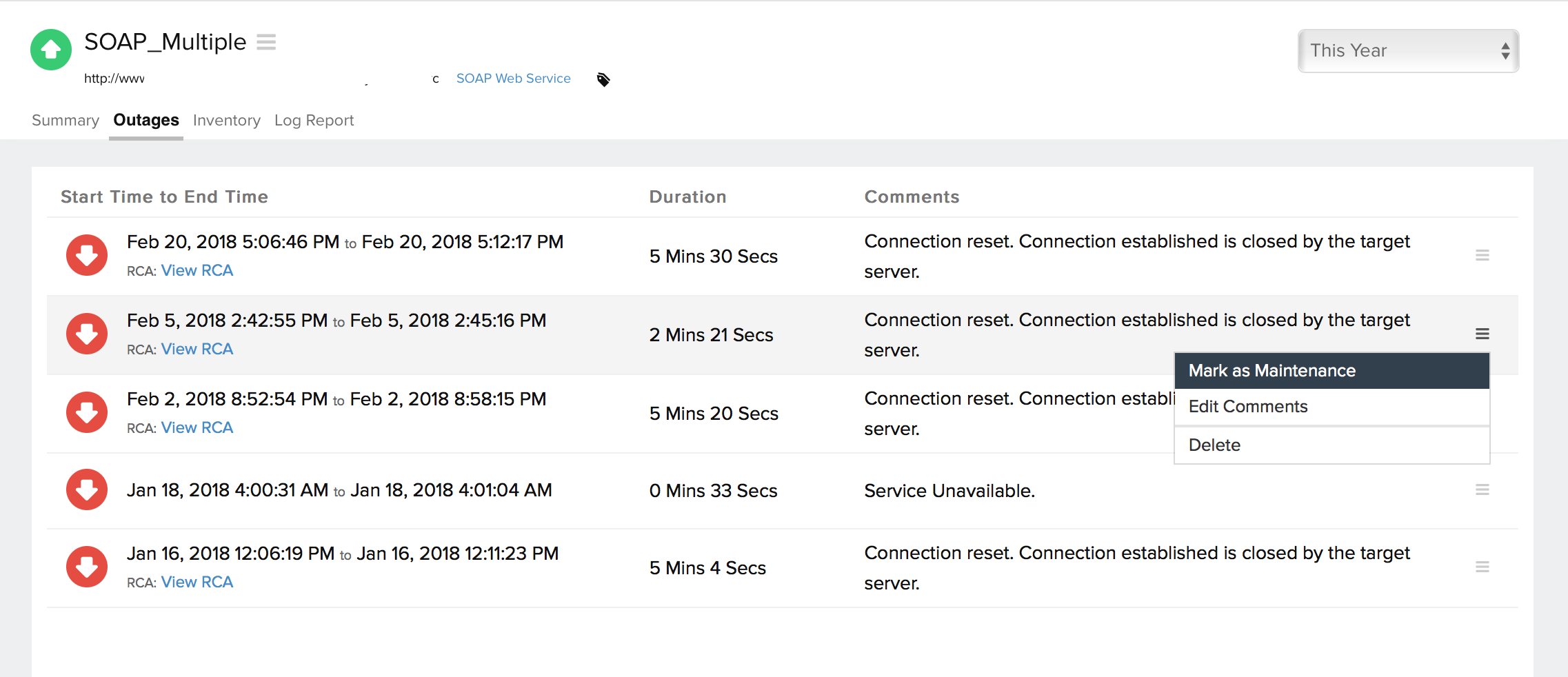 您可以访问监视器详细信息页面中的“中断”选项卡,以收集有关各种中断和维护停机时间的详细见解。它为您提供了足够的信息来解决问题。您还可以访问各种中断的根本原因分析报表。在访问