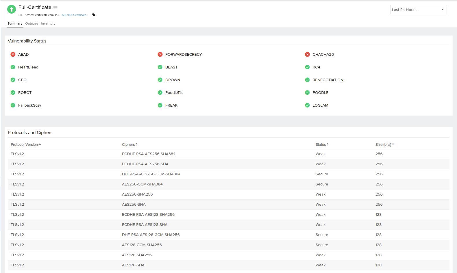 摘要仪表板可让您深入了解 SSL/TLS 证书的关键指标。监控可用性状态、证书可信度、黑名单检查结果和证书剩余有效天数显示在顶部。您可以通过选择过去 24 小时到一年前的时间范围来根据时间段自定义这些报告。