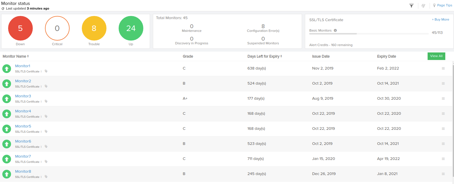 导航到状态仪表板并单击此处列出的 SSL/TLS 证书监视器,以获取有关 SSL/TLS 证书不同状态的详细报告。 此处还列出了SSL 主机详细信息,例如 显示名称、 主机名和相关 端口。您可以访问三横杠图标来执行以下操作: