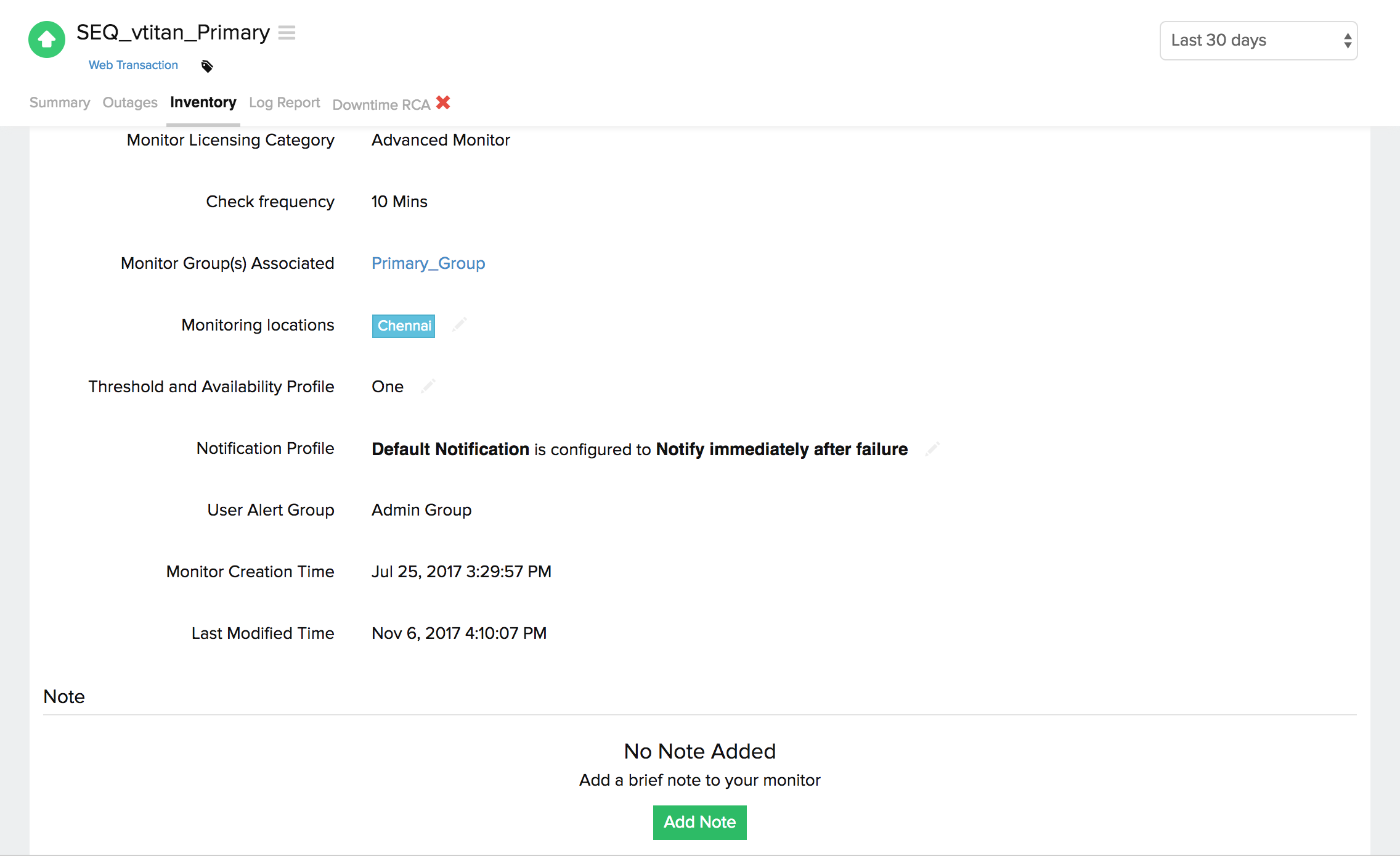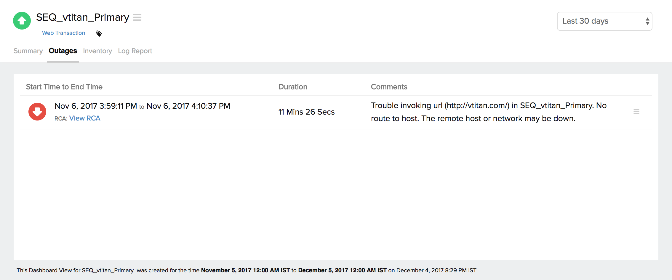 您可以访问监视器详细信息页面中的“中断”选项卡,以收集有关各种中断和维护停机时间的详细见解。它为您提供了足够的信息来解决问题。您还可以访问各种中断的根本原因分析报表。在访问