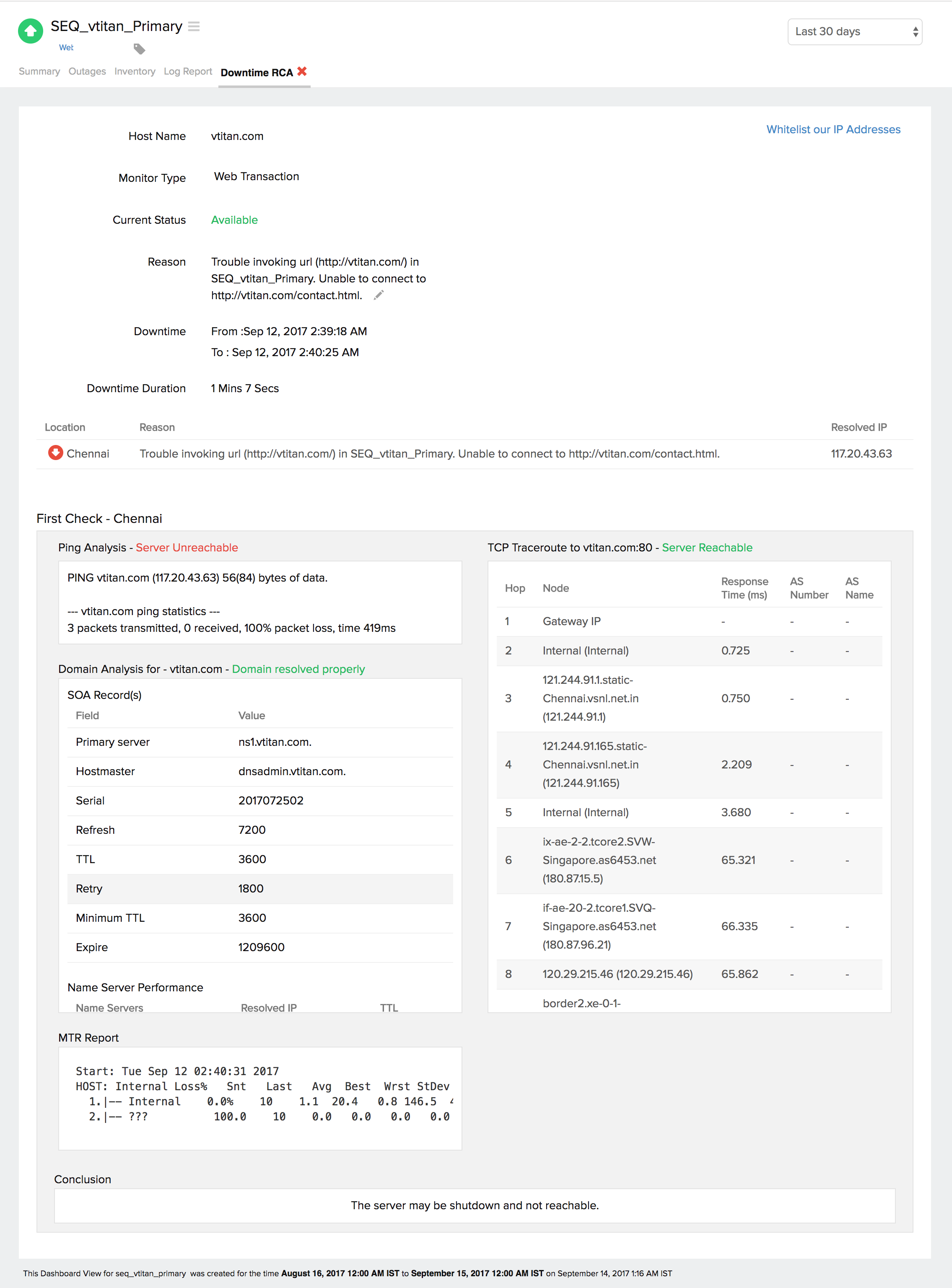 在监视器报告中断 150 秒后,您可以检索停机监视器的深入根本原因分析报表。RCA 报表提供有关您的监视器的基本详细信息、停机详细信息、重新检查详细信息和停机原因。根本原因分析会自动生成大量信息,以得出关于什么触发了停机时间的明确结论。RCA 打算确定特定停机时间或性能问题的根本原因。正常的 RCA 报表将包含以下详细信息: