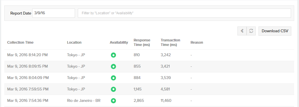通过我们针对单个监视器的集成日志记录,您可以深入了解一段时间内已配置监视器的各种日志详细信息。您还可以根据位置和可用性过滤日志。包括可用性状态、HTTP 状态代码、DNS 响应时间等在内的各种数据都在此处捕获。您还可以以 CSV 格式导出日志报表。