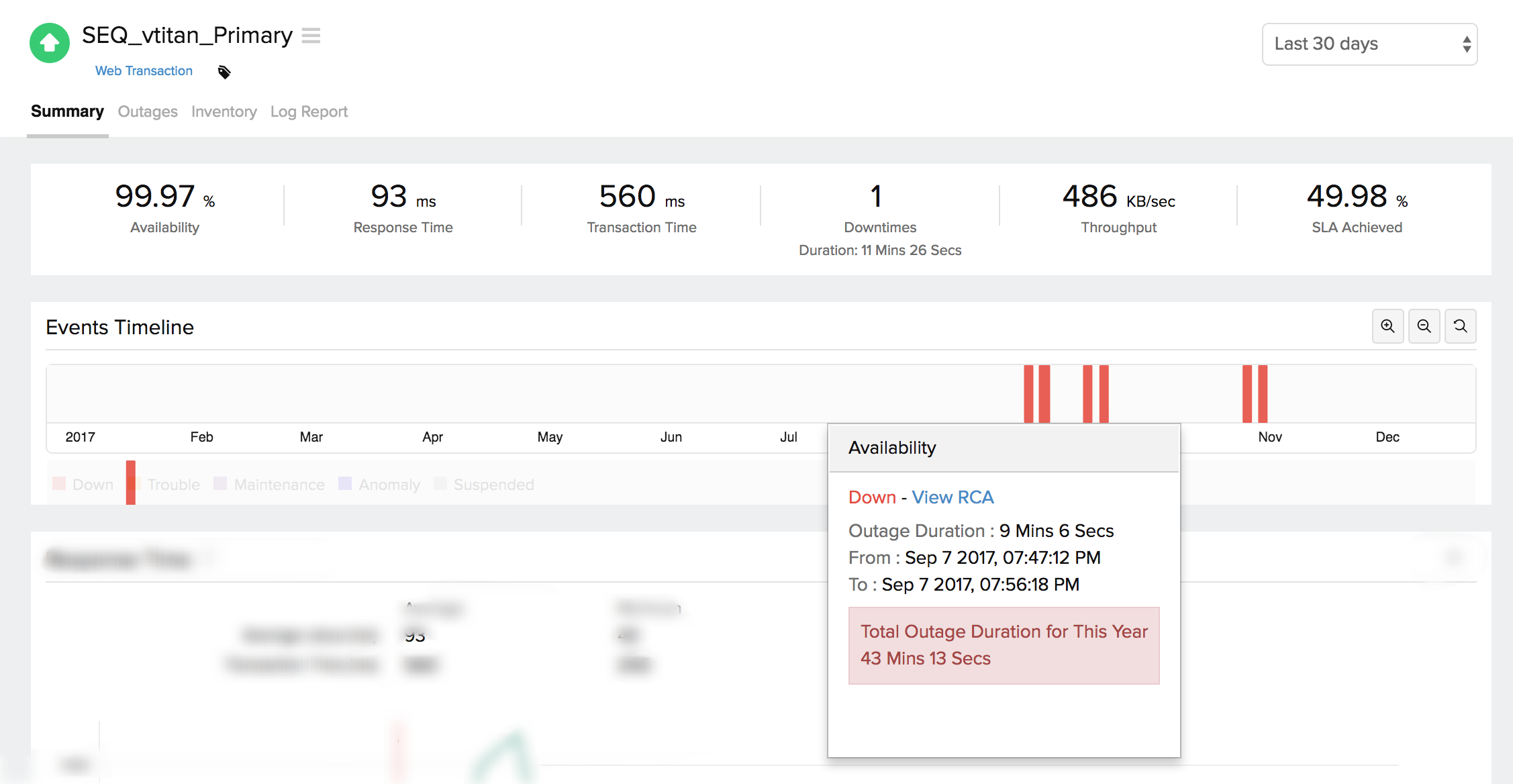 事件时间线小窗件记录所选监视器在选定时间范围内的所有过去事件。您可以识别/解码过去的各种事件,包括停机、严重、故障、维护、暂停或异常。每个事件都有颜色编码,便于识别。可以深入挖掘事件以提取最大数据并便于故障排除。您还可以跟踪特定时间段内的实际中断期和总中断持续时间。