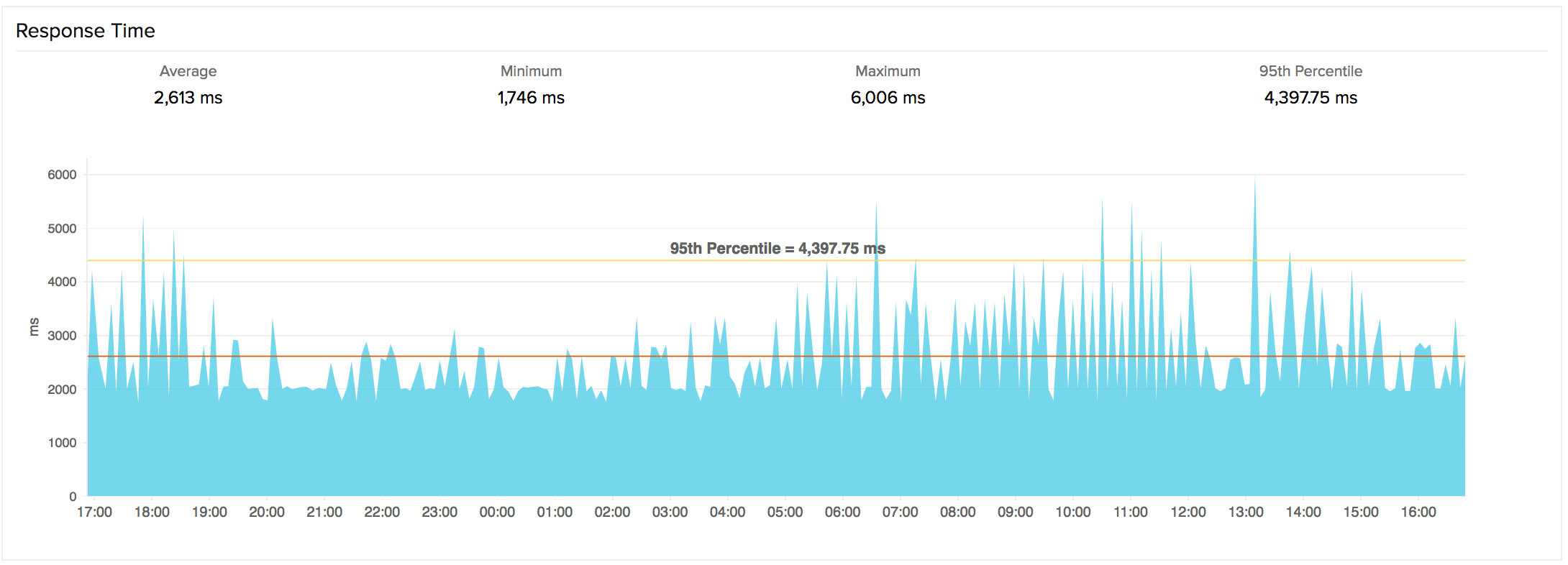 响应时间表示检索网页的整个 HTML 内容所需的总时间。该图是通过绘制时间段与响应时间的关系来计算的。您可以通过选择适当的图例进一步过滤掉三点、五点移动平均线以及 95 个百分位数。该图表还允许您放大并从图形峰值中分离出确切的数据。您还可以添加特定注释以通知用户有关各种中断和维护活动的信息。