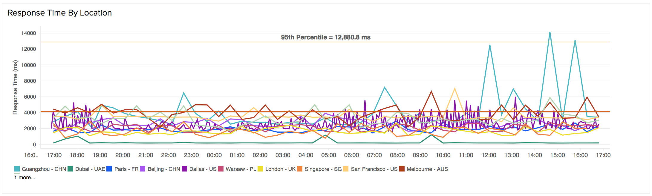 按位置的事务时间图表显示每个监控位置每天或每小时的平均/第 95 个百分位事务时间。此图可用于分析来自不同监控位置的监视器的平均事务时间。使用图表下方给出的图例标识该位置。
